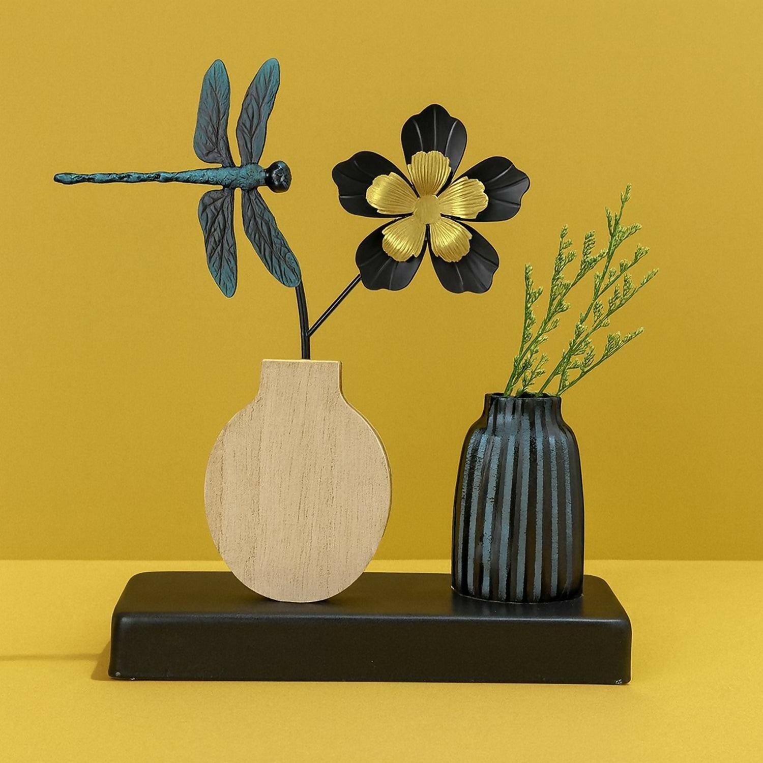 Add a touch of artistry to your home with this elegant dragonfly & flower metal showpiece mounted on a sturdy wooden base. The unique combination of a black-gold flower, dragonfly figurine, and striped vase with artificial greenery makes this décor piece stand out. Perfect for enhancing the beauty of your living room, bedroom, office desk, or entryway, it blends natural elegance with modern design.