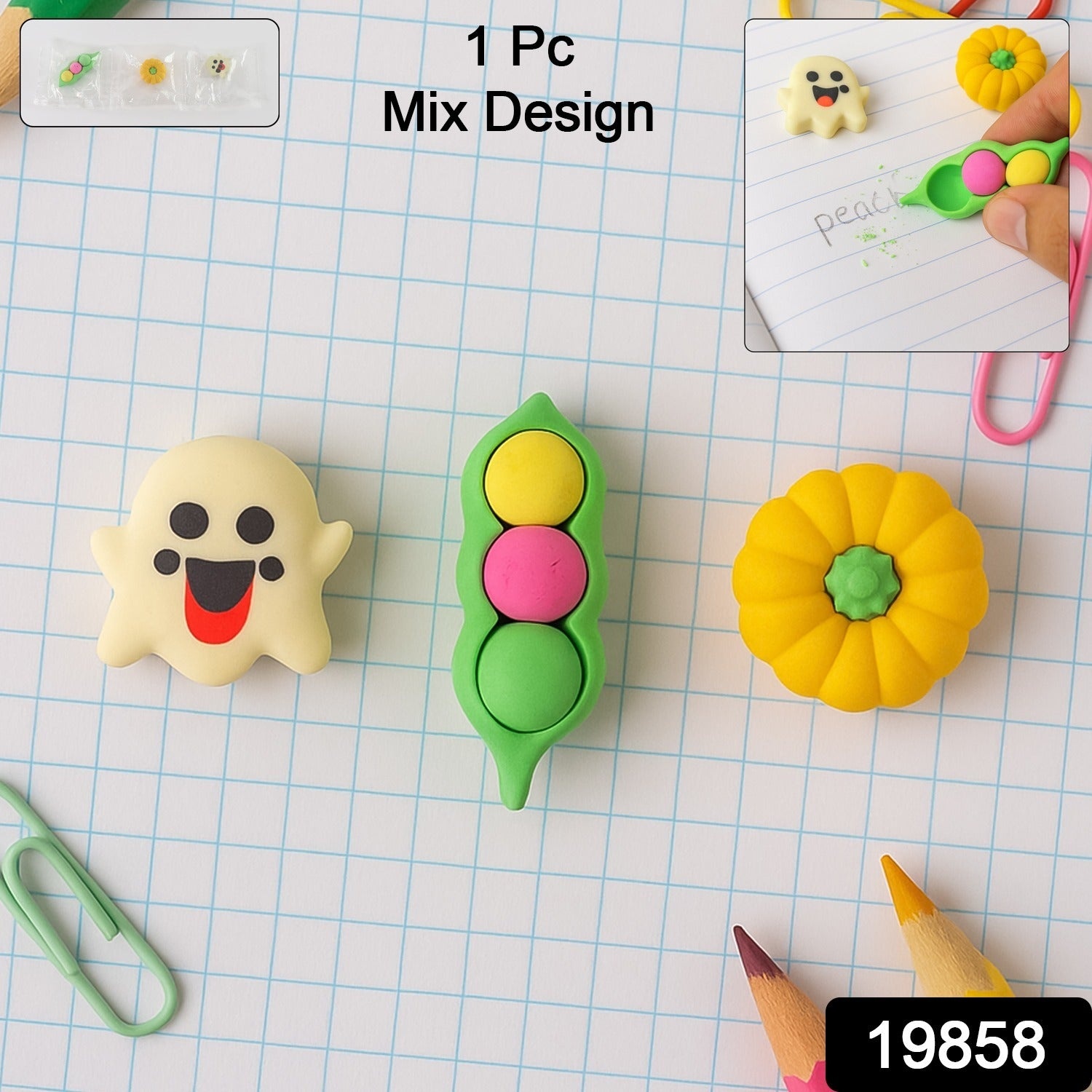 Cute Cartoon Eraser – Soft Non-Toxic TPR Rubber, Fun 3D Shapes (Ghost/Pea Pod/Pumpkin) | Clean Erasing for School & Office, Collectible Desk Toy | 1 Pc, Mixed Design