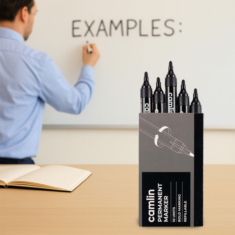 The Camlin Permanent Marker Black Pack of 10 is designed for bold and durable marking on a wide range of surfaces including paper, cardboard, plastic, glass, wood, and metal, making it a versatile choice for offices, schools, warehouses, and home use. Its rich black ink delivers clear, smudge-resistant, and long-lasting results, ensuring high visibility and permanence. The refillable design offers extended usability while reducing waste, and the durable fiber tip ensures consistent ink flow for smooth writing and marking. Comfortable to hold and easy to use, this set of 10 Camlin Permanent Markers is ideal for labeling, packaging, signage, and creative projects that require reliable and permanent marking.