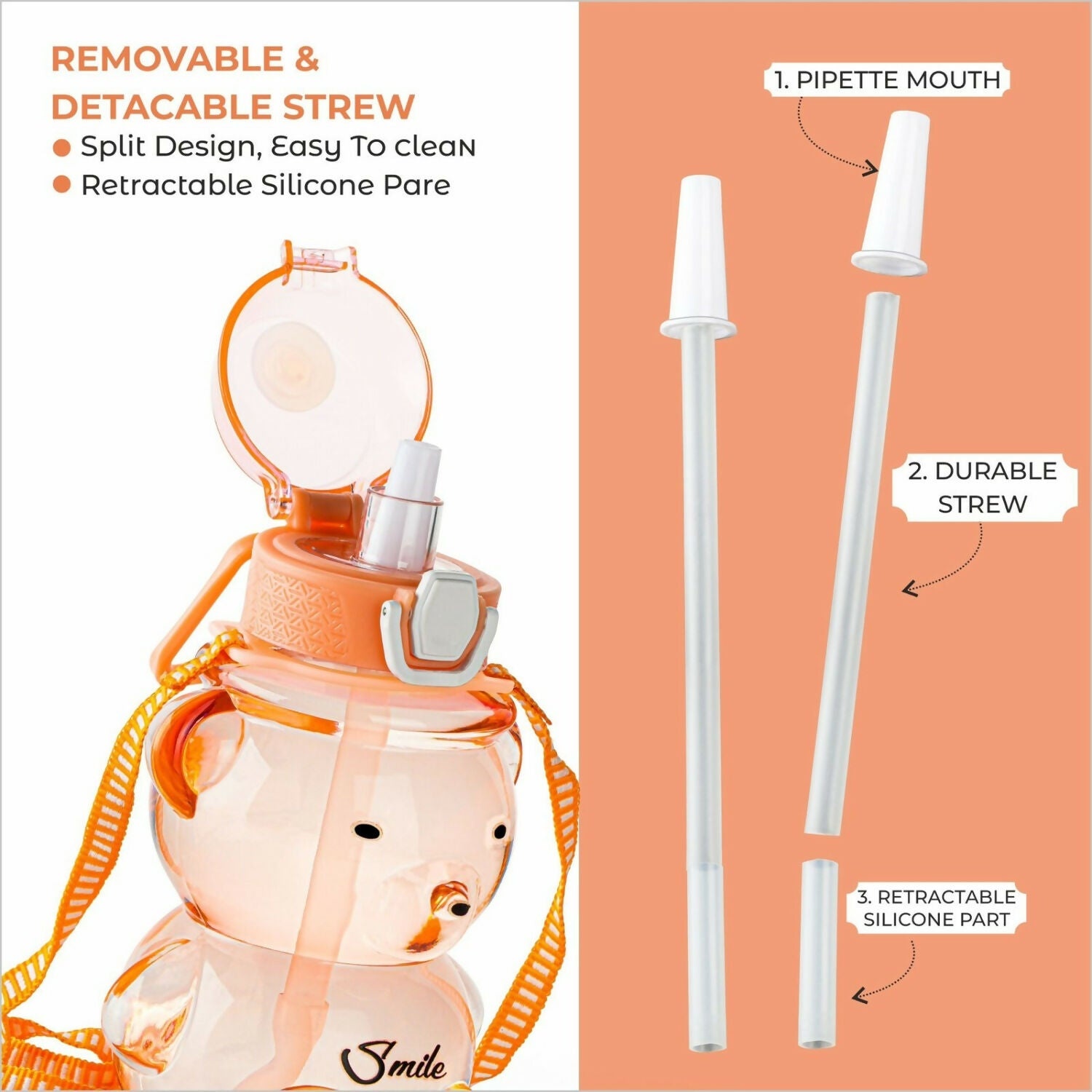 The bear's face has black eyes and a circular spout that doubles as the nose. The word "Smile" is embossed on the front of its body.