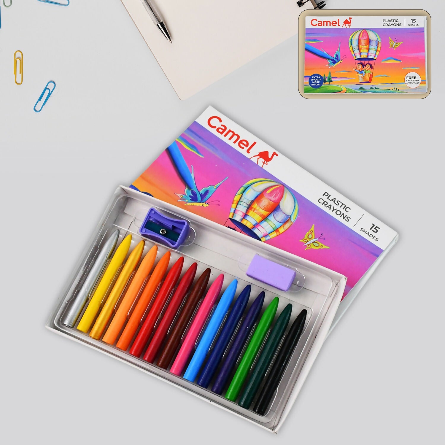 Camel Plastic Crayons 15 Assorted Shades with Free Sharpener and Eraser