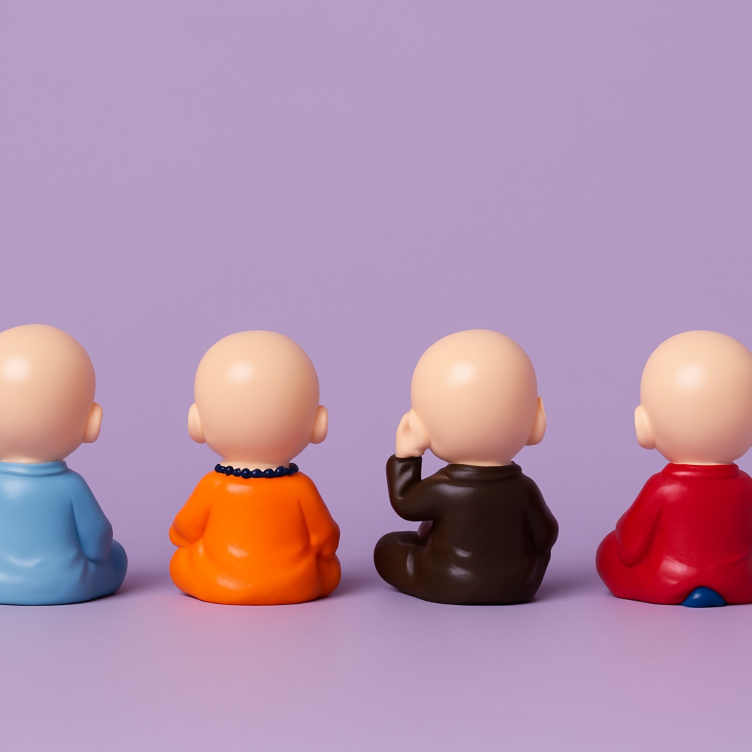 Set of 4 Mini Monk Figurines – each in different poses & colors (blue, orange, brown, red).