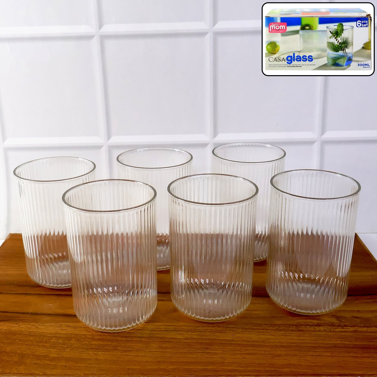 Supermom Casa Glass Set – 6 Piece Transparent 300 ml Tall Ribbed Glasses for Water, Juice, Cold Drinks & Daily Beverages