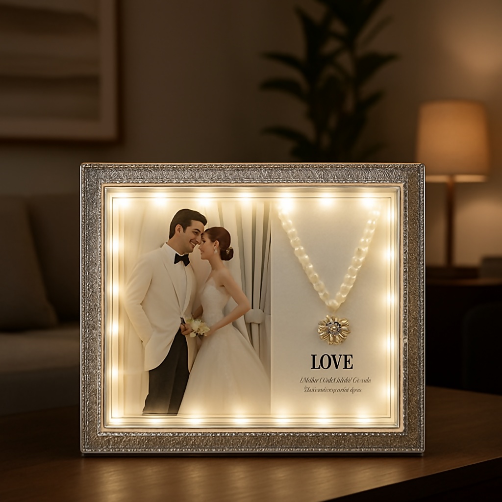Perfect for wedding photos, couple portraits, and anniversary gifts, the frame comes with built-in warm LED lights that softly highlight your favorite pictures, creating a cozy and romantic atmosphere. Whether you place it on your bedside table, living room showcase, or office desk, this luxury decorative photo frame enhances any space beautifully.