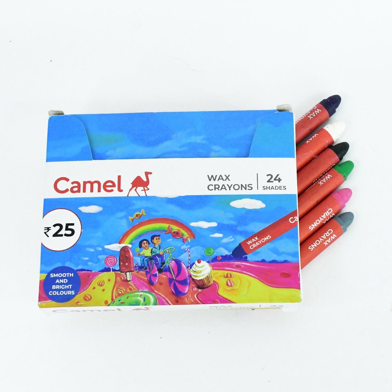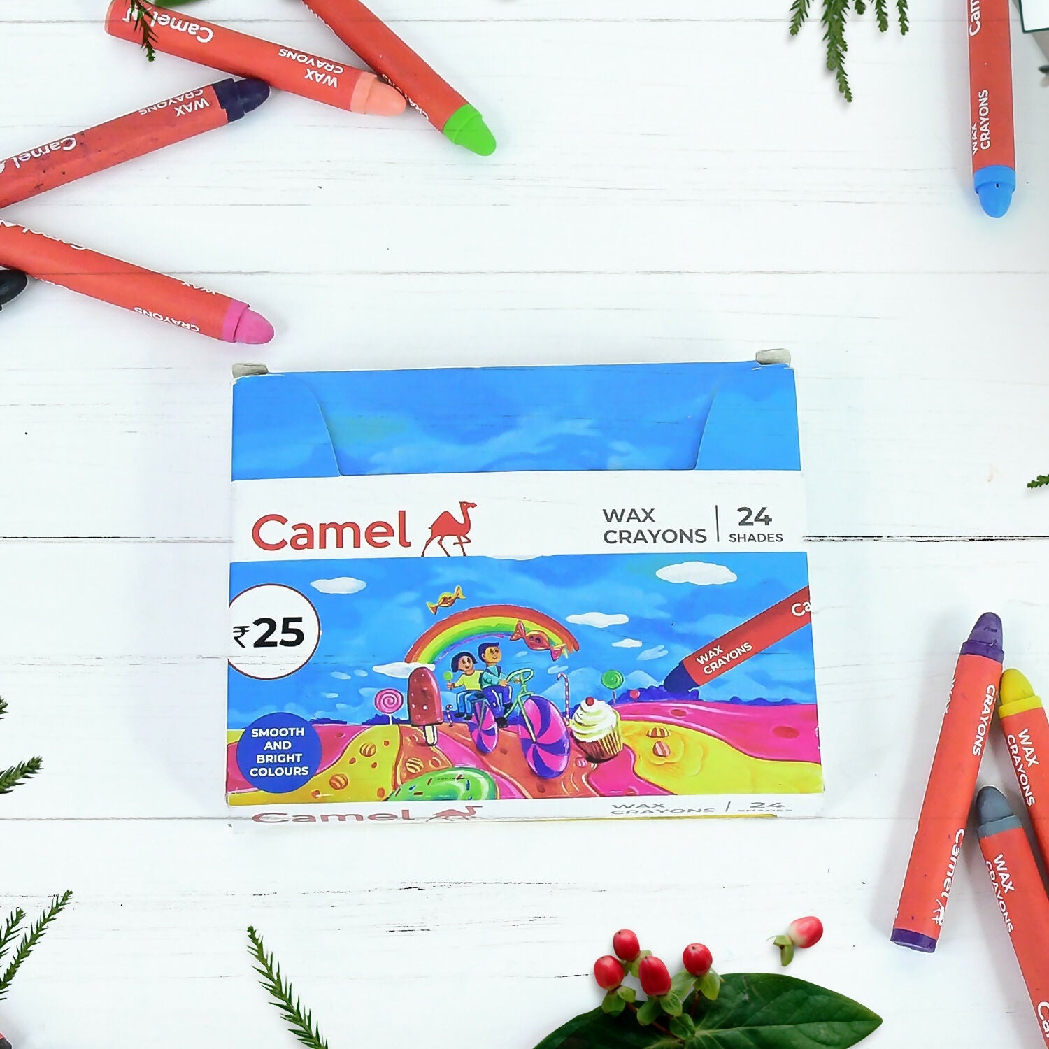 Camel Wax Crayons – 24 Vibrant Shades Smooth Colouring Set for Kids, Students, and Hobby Artists with Free Scraper