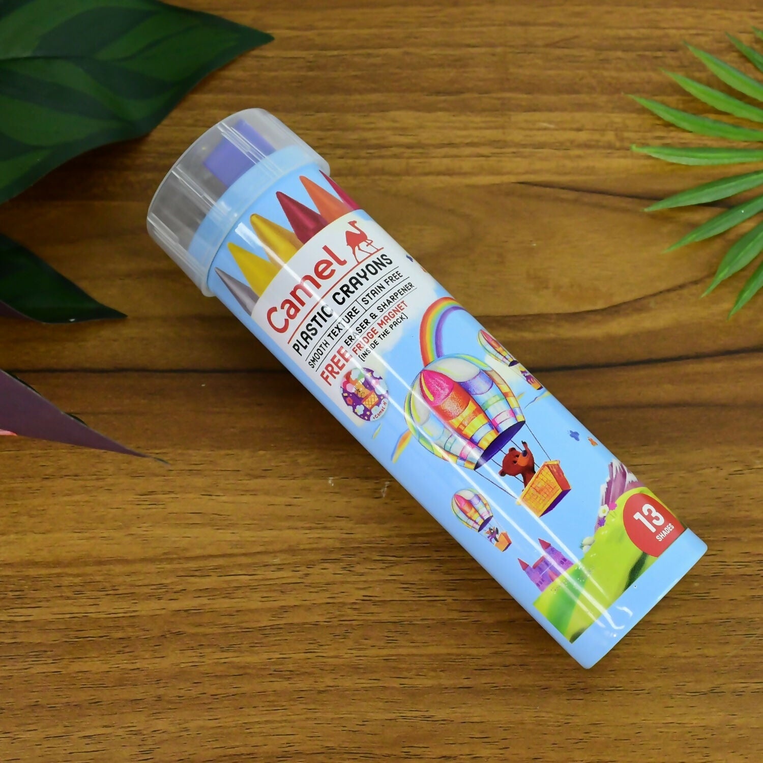 The Camel Plastic Crayons 13 Shades Pack is a vibrant and safe colouring set designed to inspire creativity in children. These crayons feature a smooth, non-waxy texture that delivers rich, consistent colours without smudging or staining hands. The set includes 13 bright shades along with a free eraser and sharpener, making it an all-in-one colouring solution for school, home, and creative projects. Packed in a durable, reusable cylindrical box, this set ensures easy storage and portability. Ideal for budding artists, students, and hobbyists, these crayons are non-toxic, long-lasting, and perfect for enhancing imaginative expression.