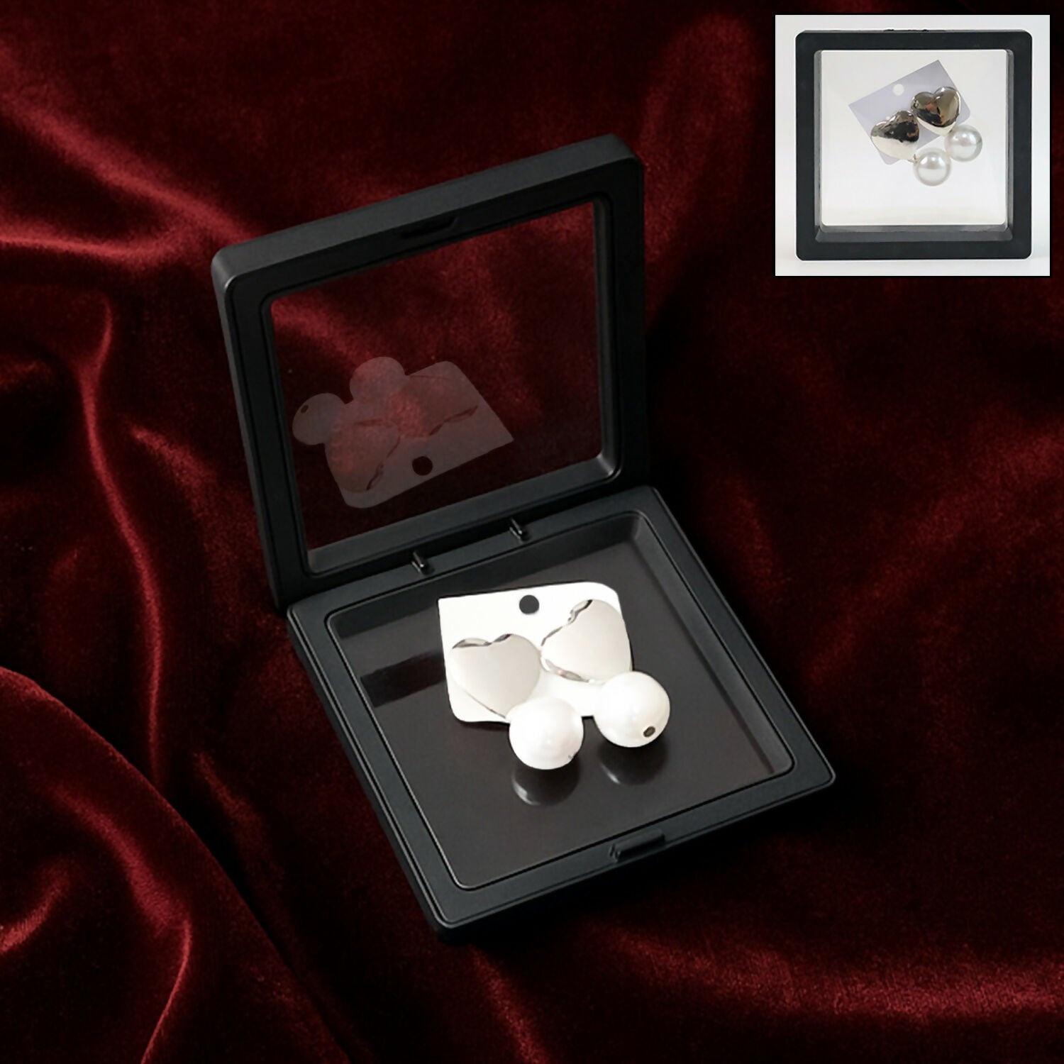 Heart-Shaped Stud Earrings with Dangling Pearls in Elegant Display Case