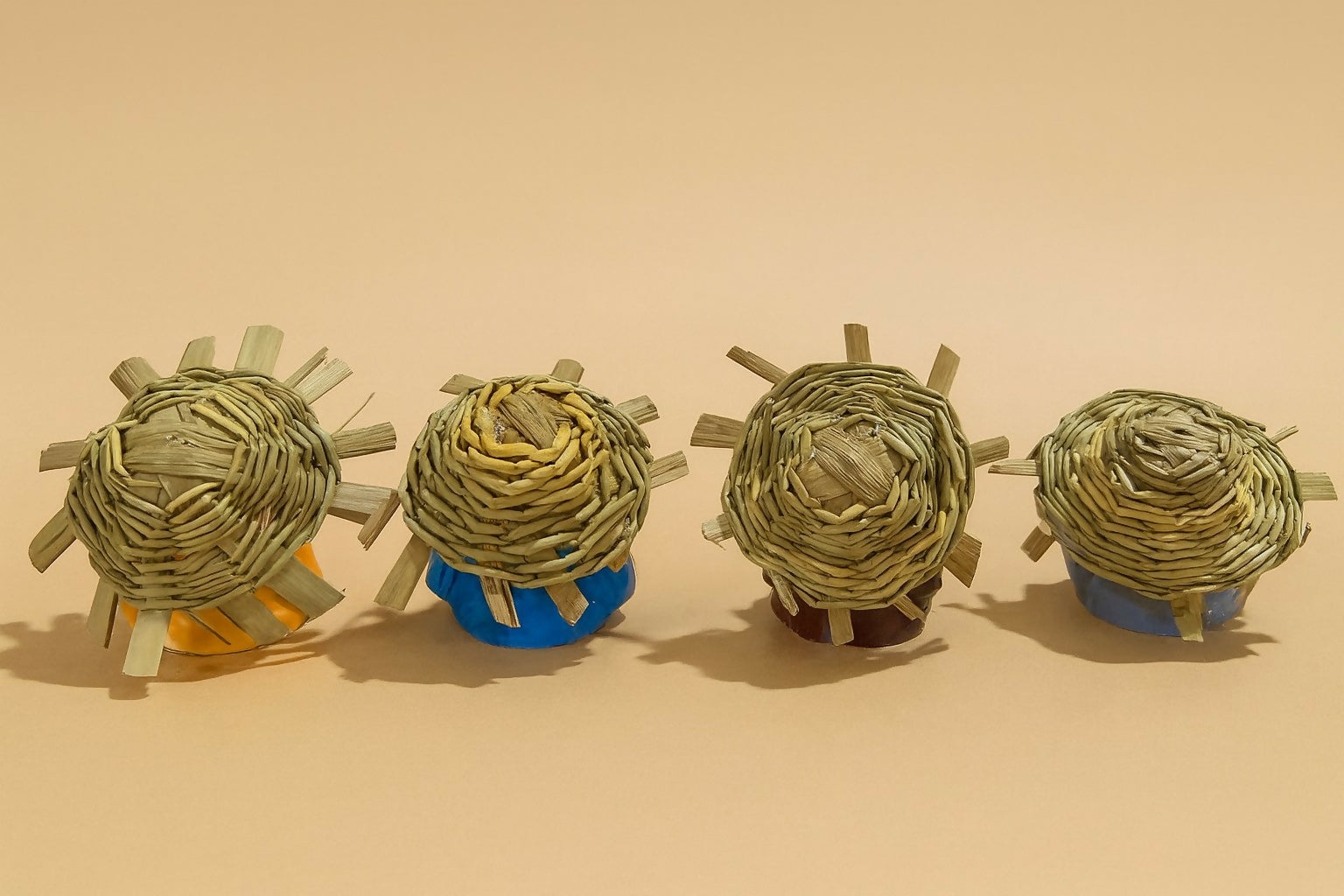 🎨 Vibrant Hand-Painted Colors – Orange, Blue, Maroon & Purple robes with straw hats