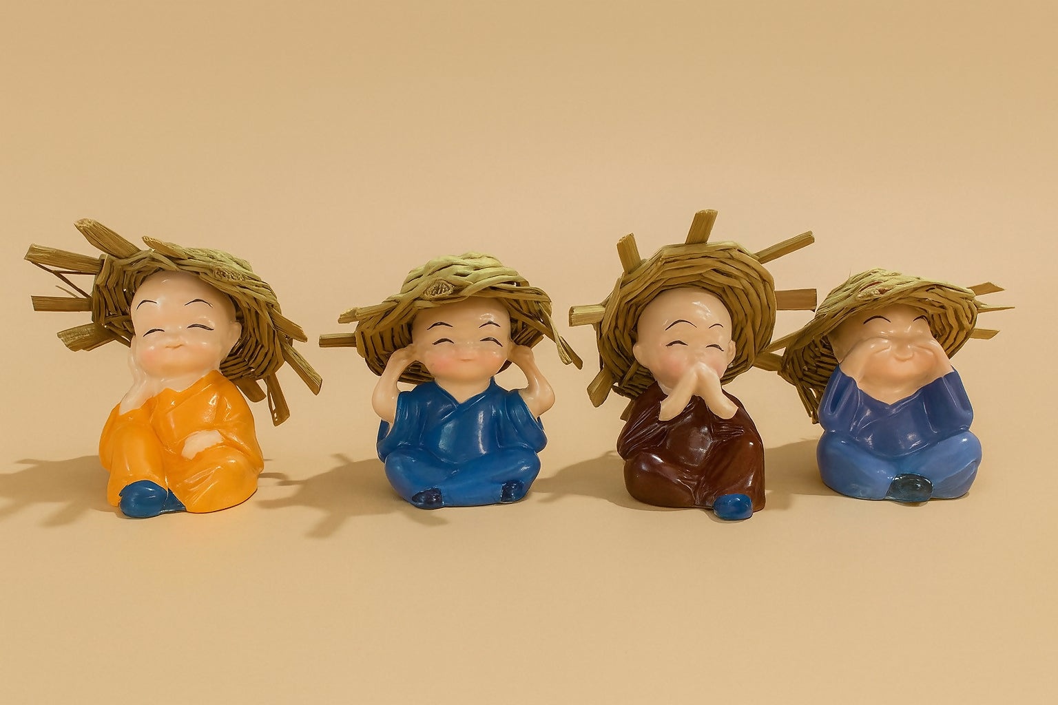 monk showpieces set of 4, hear no evil see no evil speak no evil figurines, mini monk statues for home décor, cute monk idols for gifting, resin monk statues with hat, car dashboard decorative items, feng shui showpieces, spiritual gift items, peaceful monk figurines, laughing monk idols for table decor
