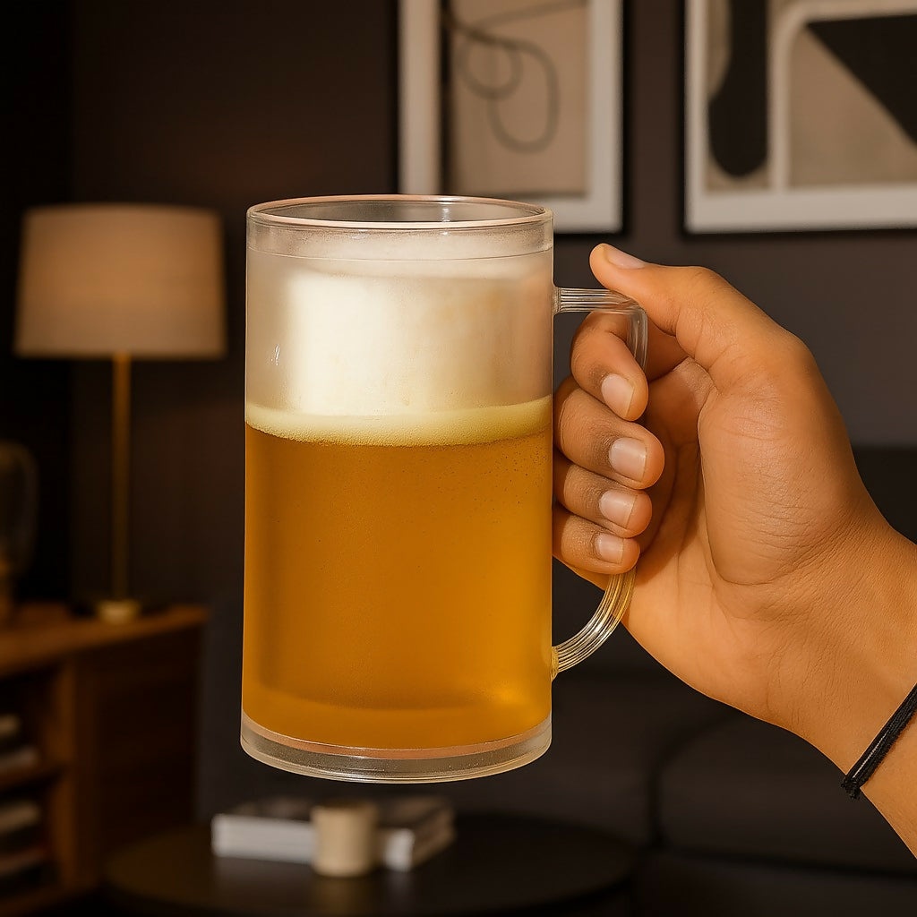 Sip in style with this sleek frosted beer mug designed for modern drink lovers. With a minimalist cylindrical shape and matte finish, this glass offers a clean and sophisticated look while keeping your drinks refreshingly cold. Perfect for beer, cold coffee, mocktails, and more, its sturdy handle and large capacity make it the ideal companion for casual evenings, celebrations, or bar setups at home.