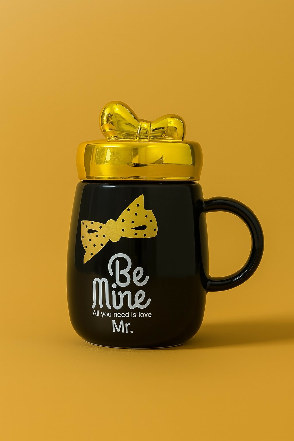 "Be Mine Mr. Black Ceramic Coffee Mug with Golden Lid and Bow Tie