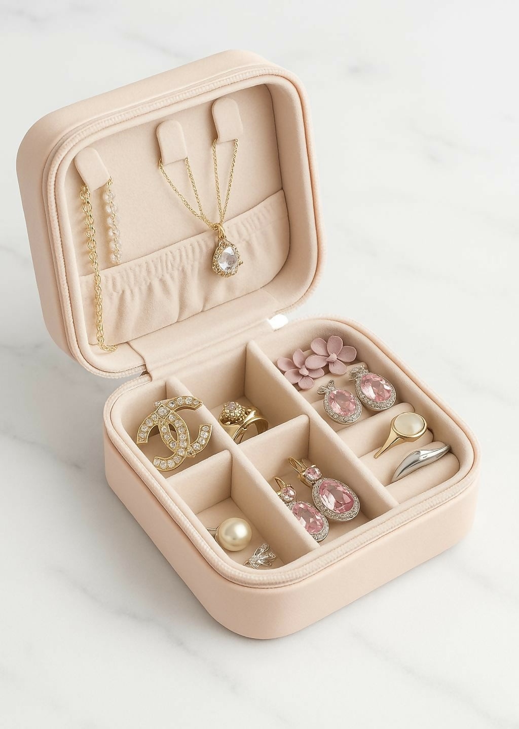 Keep your jewelry organized in style with this elegant Velvet Travel Jewelry Organizer Box. Designed for modern women on the go, this blush pink case is both compact and spacious, with multiple compartments to hold rings, earrings, necklaces, pendants, and bracelets. The soft velvet interior protects delicate items from scratches and damage, while the sturdy exterior ensures long-lasting use. Its secure zipper closure and lightweight design make it perfect for travel, gifting, or everyday use at home. Whether you’re organizing your collection or searching for the perfect gift, this chic and functional jewelry box is a must-have accessory.