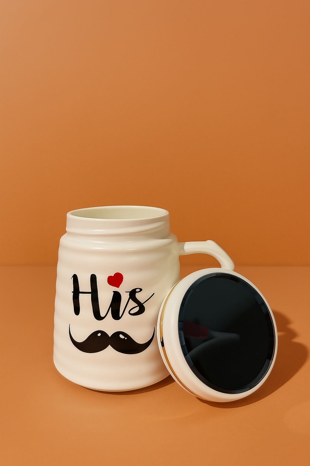 Stylish White Ceramic "His" Coffee Mug with Mustache Print and Lid