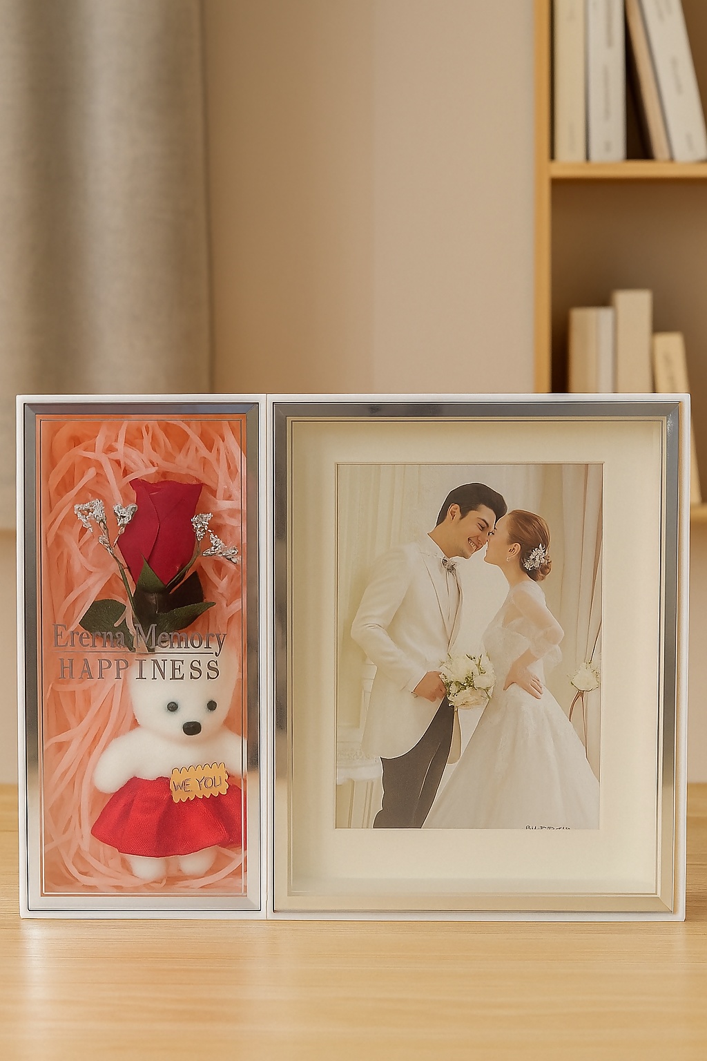Celebrate your cherished moments with this elegant dual-sided LED photo frame. One side features a romantic wedding photo space illuminated by soft LED lights, while the other side includes a cute teddy bear, a red rose, and the message "Eternal Memory Happiness." Perfect as a wedding gift, anniversary present, or home decor accent. Made with premium materials for a polished, modern look, this frame adds a heartfelt touch to any setting.