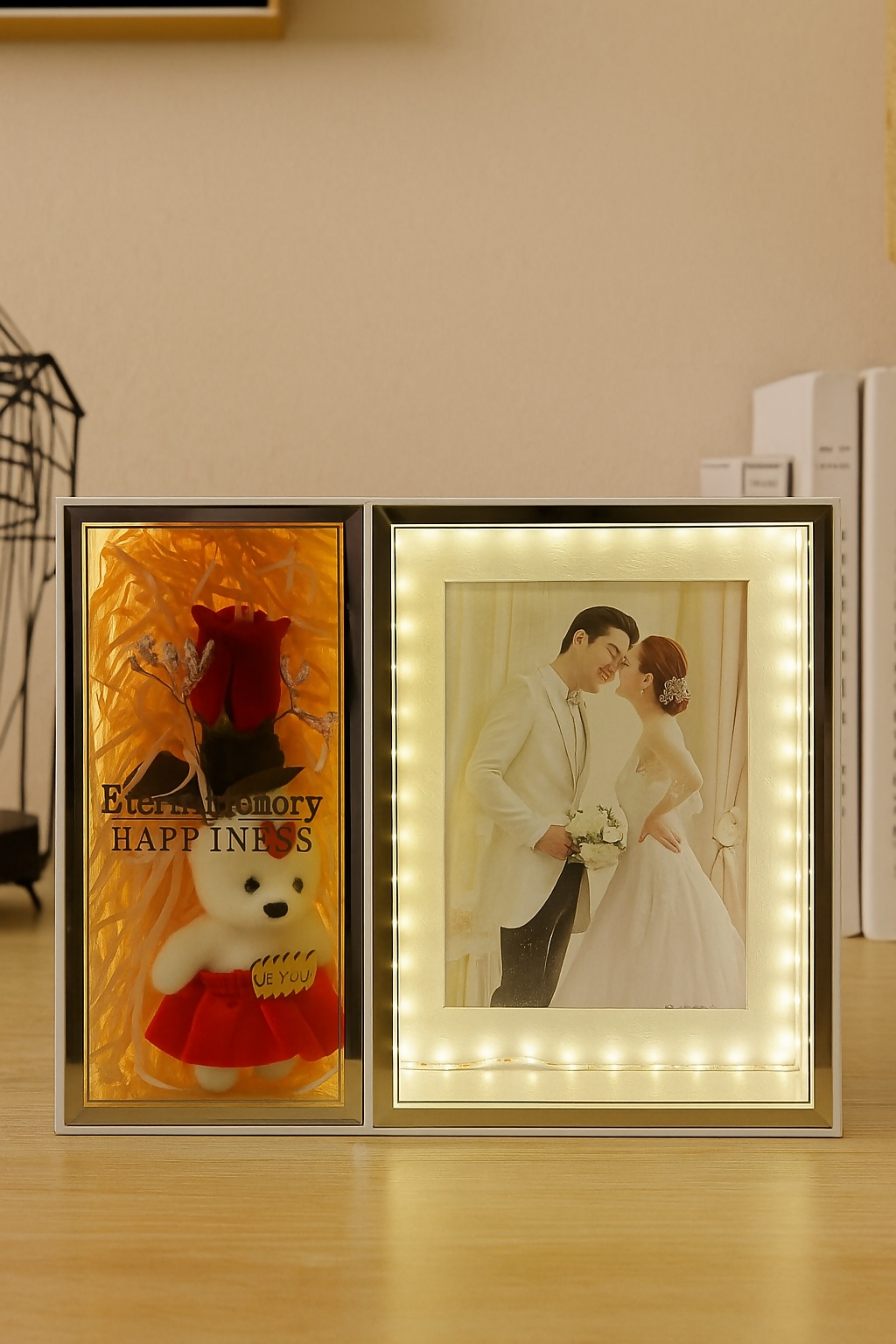 wedding photo frame with light, LED photo frame for couple, romantic gift for anniversary, teddy and rose photo frame, dual frame decor, couple frame gift, forever love frame, wedding keepsake frame, gift for bride and groom, romantic memory frame.