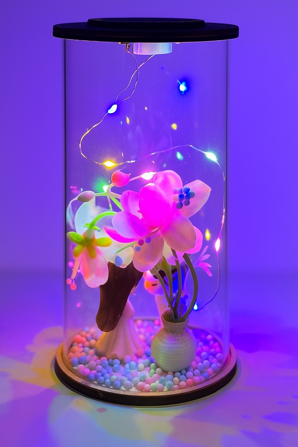 The LoveGlow Dome is a romantic LED glass dome lamp featuring a miniature couple in love surrounded by delicate flowers and fairy lights. This enchanting piece blends charm and mood lighting, making it a perfect gift for anniversaries, weddings, or simply to express heartfelt emotions. Softly lit with multicolor LEDs, it creates a magical ambiance wherever it’s placed.