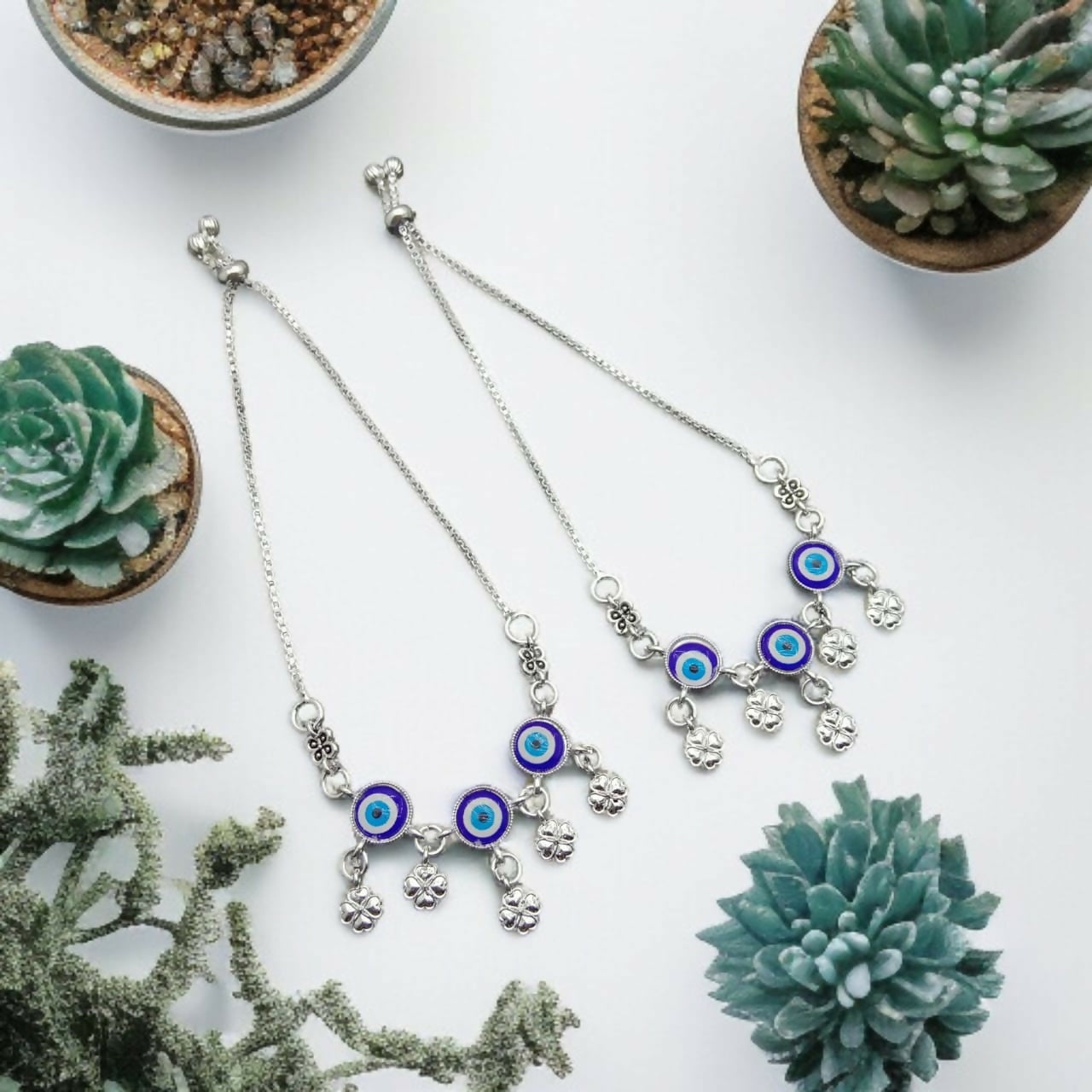 Evil Eye & Four-Leaf Clover Charm Adjustable Silver Anklets