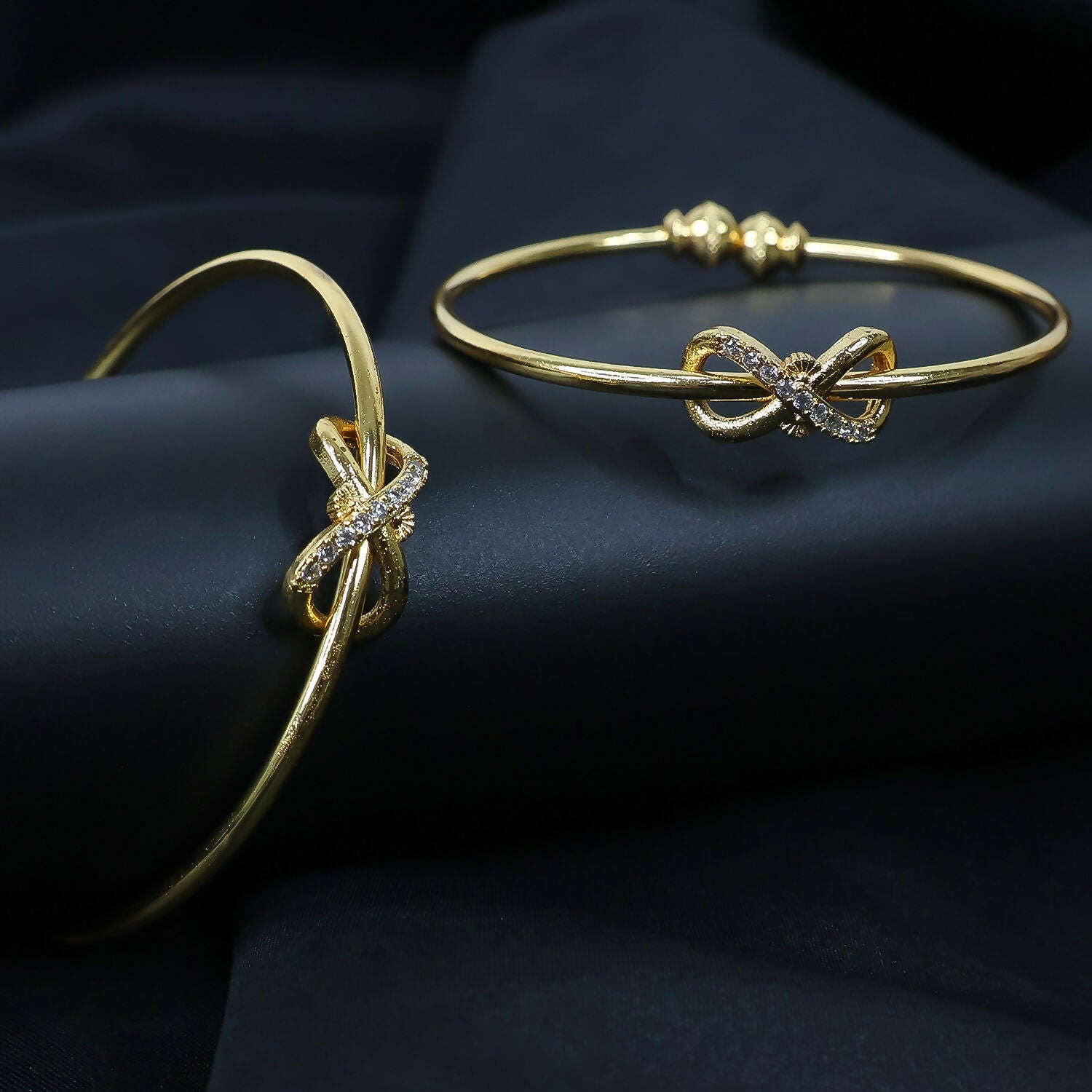 These graceful bangles showcase a refined knot design at the center, delicately accented with shiny stones for a subtle sparkle. The smooth finish and sleek profile offer a modern yet timeless look, perfect for casual outings, festive events, or gifting. Comfortable to wear and easy to pair, they bring a touch of understated elegance to any style.