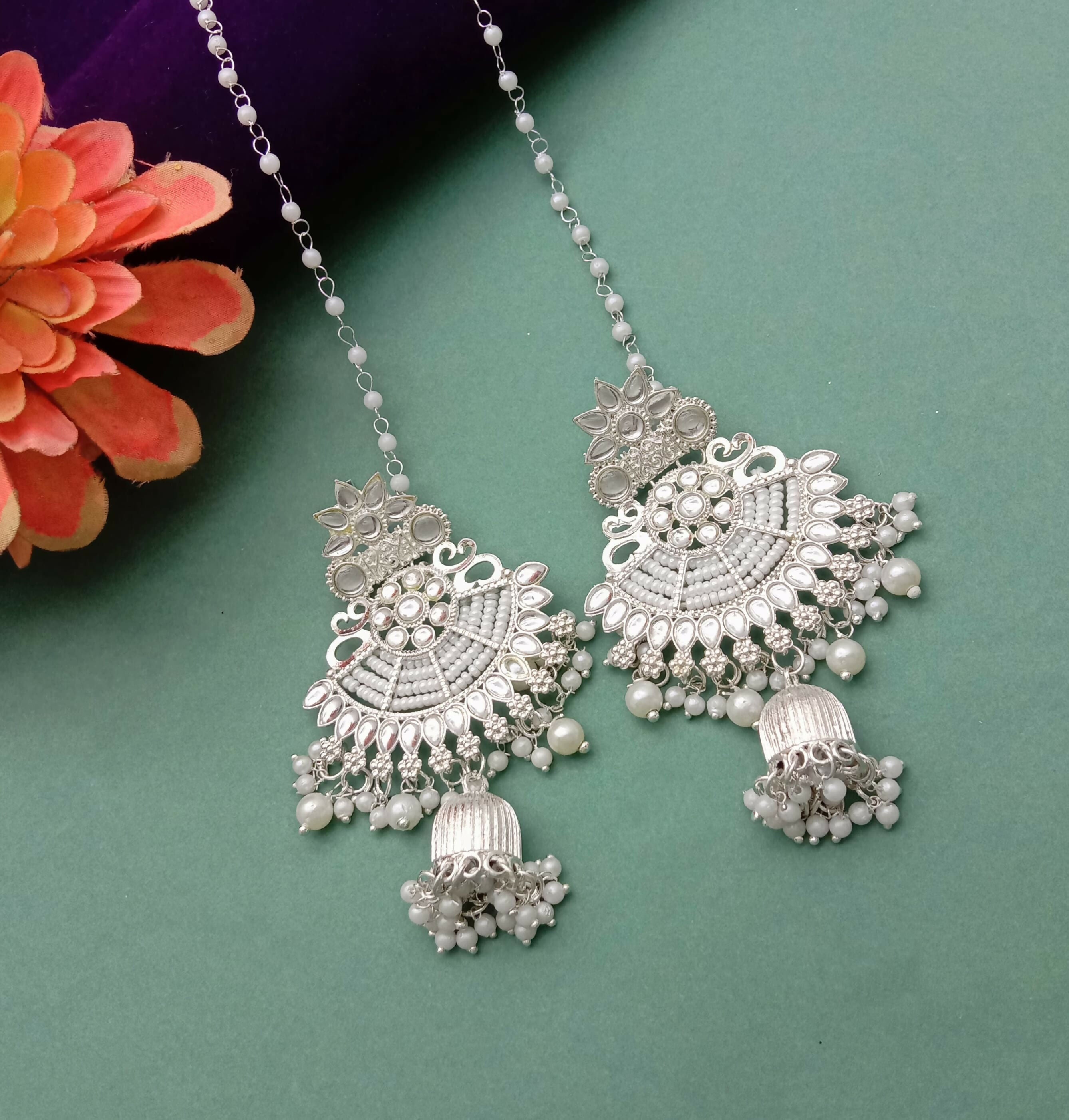 Silver-Plated Pearl Jhumka Chandbali Earrings with Sahare (Ear Chains)