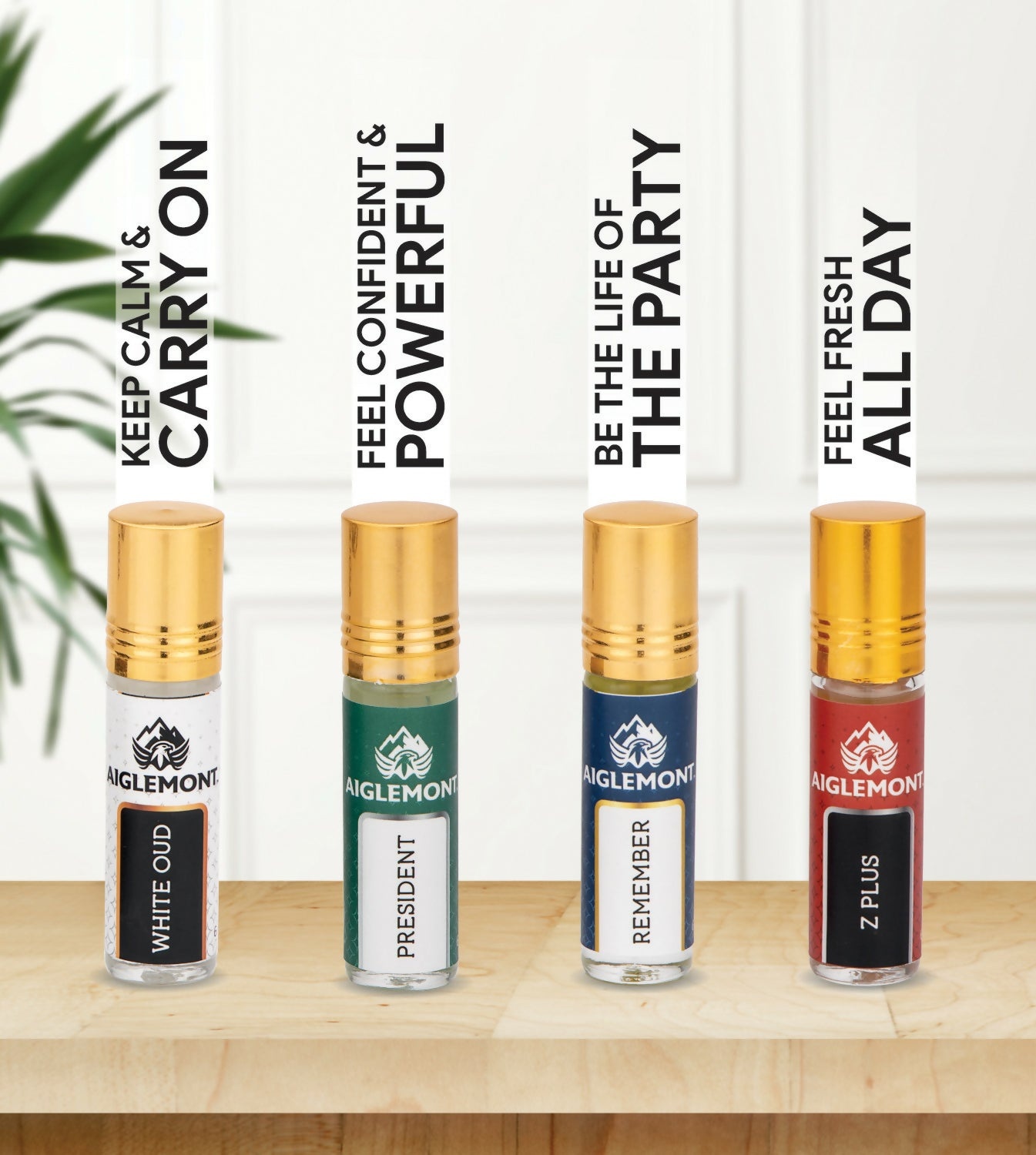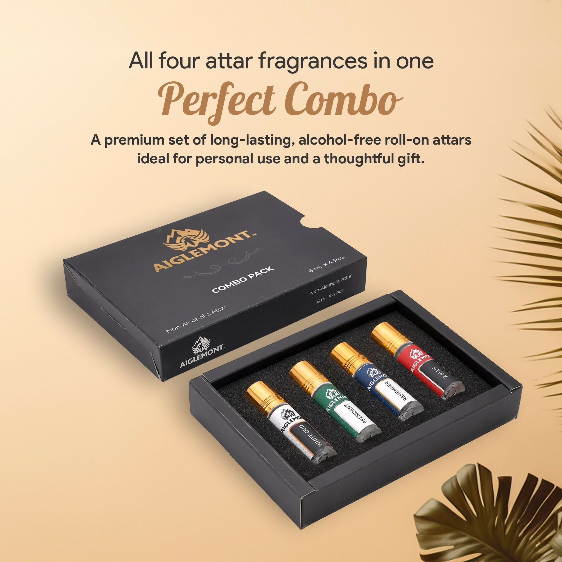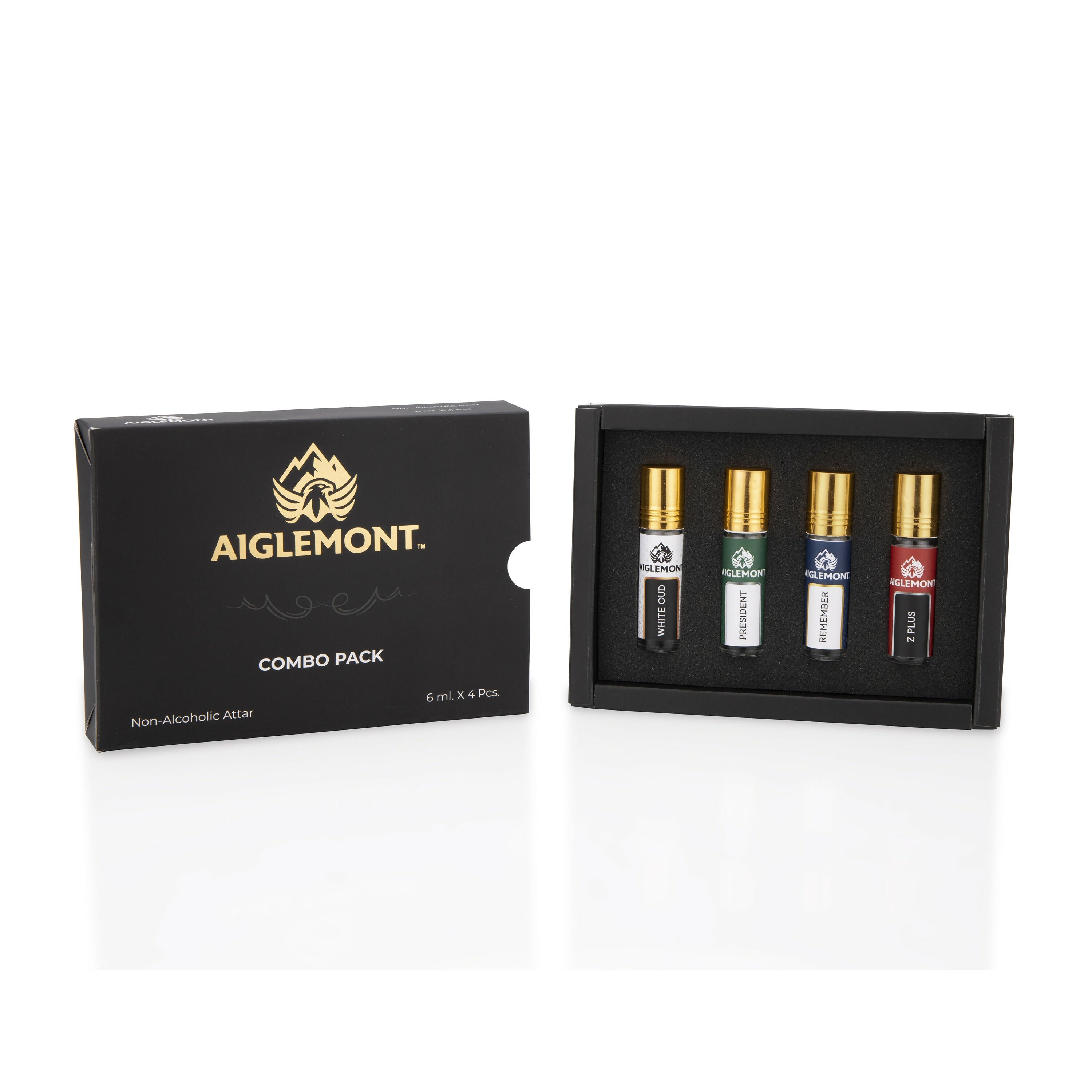 This set includes 4 long-lasting 6ml roll-on attar perfumes in signature scent White oud, Remember, President & Z Plus.