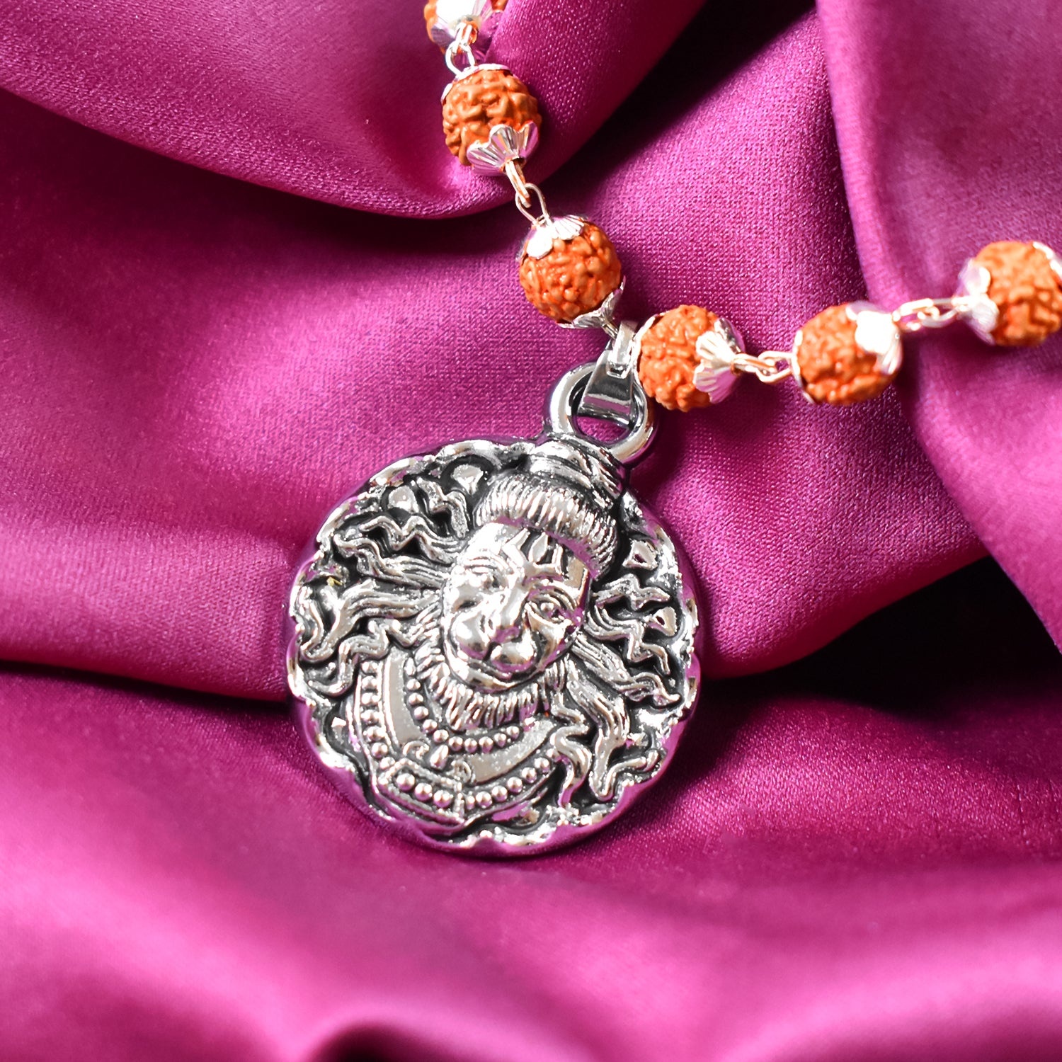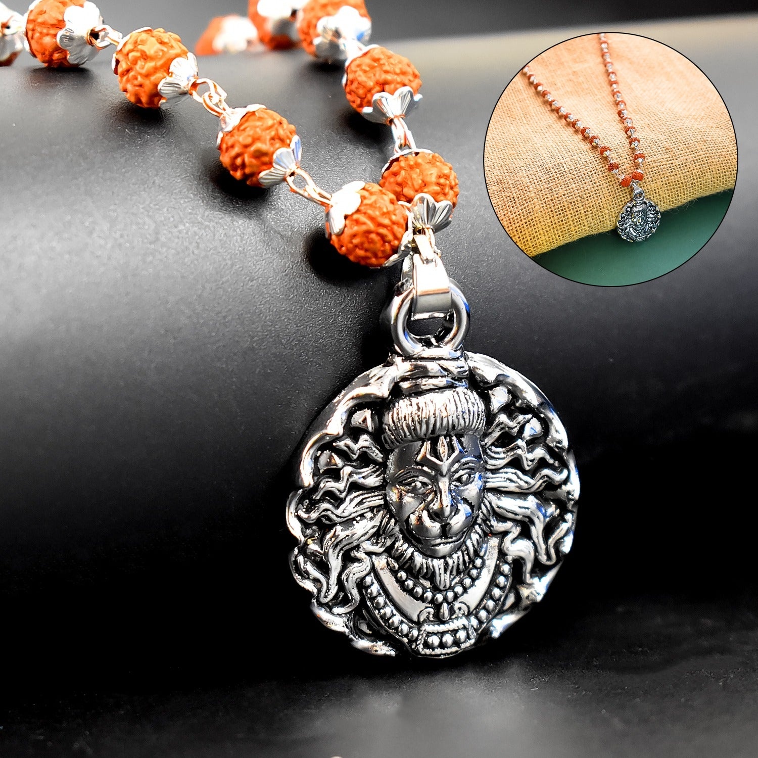 This stunning Rudraksha & Hanumanji Pendal Chain combines the spiritual power of Rudraksha beads with the divine energy of Lord Hanuman. The pendant features a beautifully detailed image of Hanumanji, symbolizing strength, protection, and devotion, while the Rudraksha beads are known for their sacred properties, offering spiritual grounding and blessings of peace and health. The Rudraksha beads are carefully strung along the chain, each bead representing a connection to divine energy. This sacred design not only adds a touch of elegance but also serves as a powerful reminder of your faith. Ideal for daily wear or special occasions, this chain offers a perfect blend of devotion, protection, and style—empowering the wearer with positive energy and divine blessings.