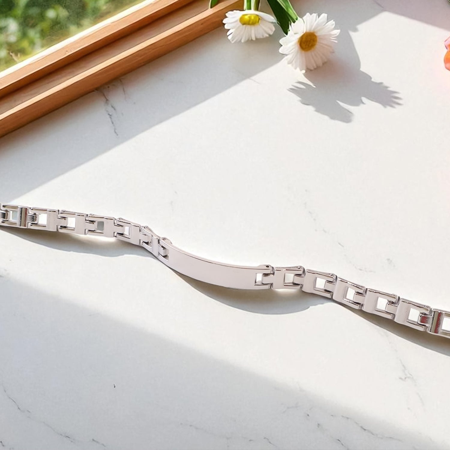 Celebrate the everlasting bond of love with this Customized Silver Bracelet , uniquely designed in a bold box chain style. Crafted from high-quality stainless steel, this offers a sleek, contemporary look while maintaining traditional sentiment. The central engravable nameplate lets you personalize it with a name or message, turning it into a meaningful keepsake that your brother or loved one can wear even after Raksha Bandhan. The premium silver polish adds a refined finish, and the robust build ensures long-lasting durability. It’s more than just’s a timeless token of affection, perfect for gifting with heart.