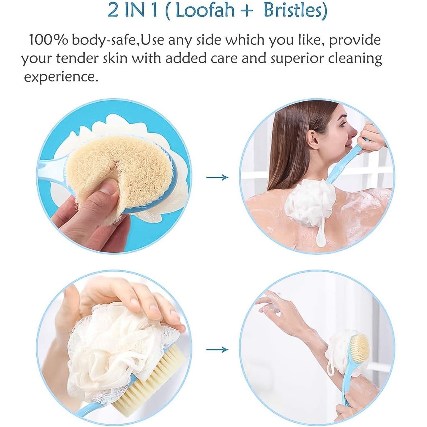 - Long Handle Effectively cleans your body as it long handle makes it reach even your mid-back, hamstrings, & other not-so-easy to reach body parts.