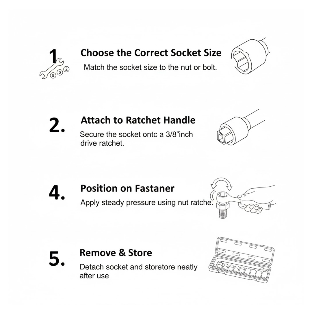 • Standard Sockets: 3/8, 7/16, 1/2, 9/16, 5/8, 11/16, 3/4, 3/16, 7/8-in.