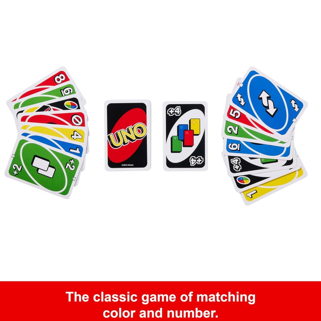UNO is the classic and beloved card game that’s easy to pick up and impossible to put down! Players take turns matching a card in their hand with the current card shown on top of the deck either by color or number. Special action cards deliver game-changing moments as they each perform a function to help you defeat your opponents. These include Skips, reverses, draw twos, color-changing wild and draw four wild cards. You’ll find 25 of each color (red, green, blue, and yellow), plus the eight wild cards, inside the 108-card deck. If you can’t make a match, you must draw from the central pile! And when you’re down to one card, don’t forget to shout UNO The first player to rid themselves of all the cards in their hand before their opponents wins. It’s fast fun for everyone! Includes 108 cards and instructions. Colors and decorations may vary.
