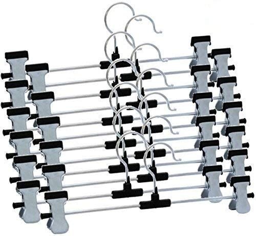 12 pack of sturdy stainless steel skirt hangers with 2 non slip clips adjustable are made of metal stainless steel hangers and chrome plated process with superior bearing ability, robust and easy to use, prevents rust resists breakage.