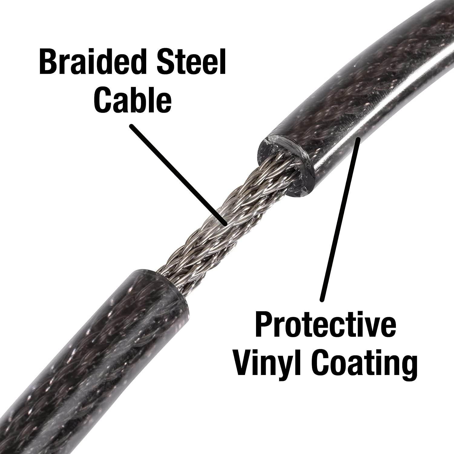 DURABLE DESIGN: Cable is made from braided steel for strength and flexibility; protective vinyl coating prevents scratching