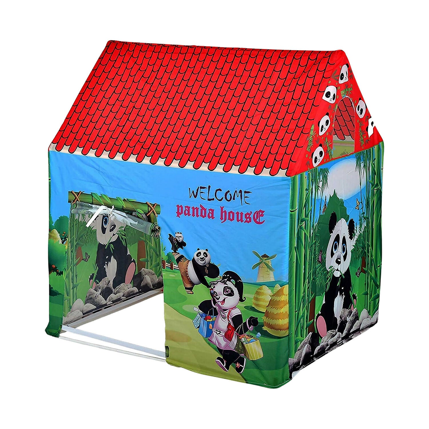 Bring home endless fun with this Panda Theme Foldable Kids Play Tent House, designed with adorable cartoon panda characters and a colorful jungle background. The bright red roof pattern combined with lively green and blue graphics creates an exciting and cheerful play environment for children.