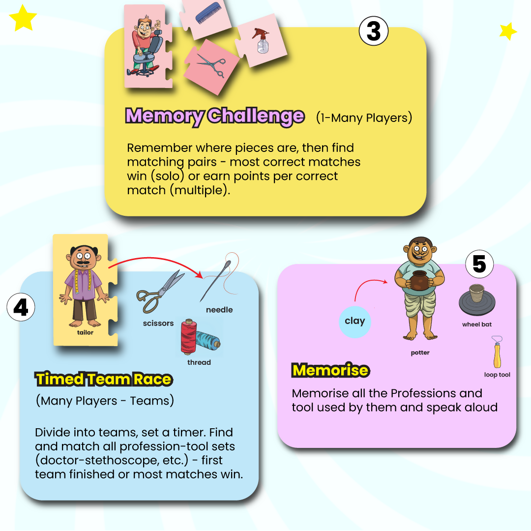 - (Solution): The profession puzzle can showcase who they are and what all tools they carry with them.