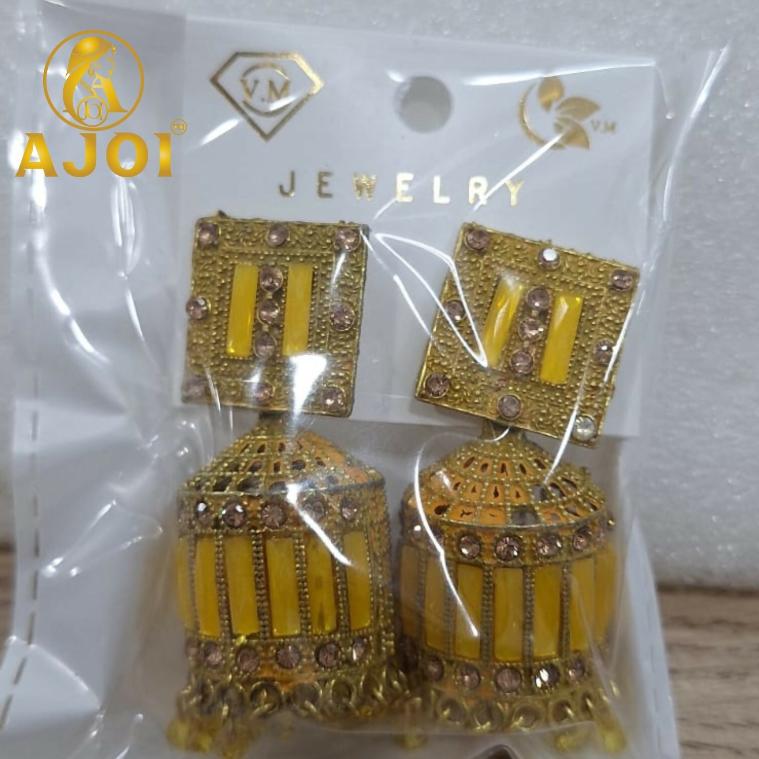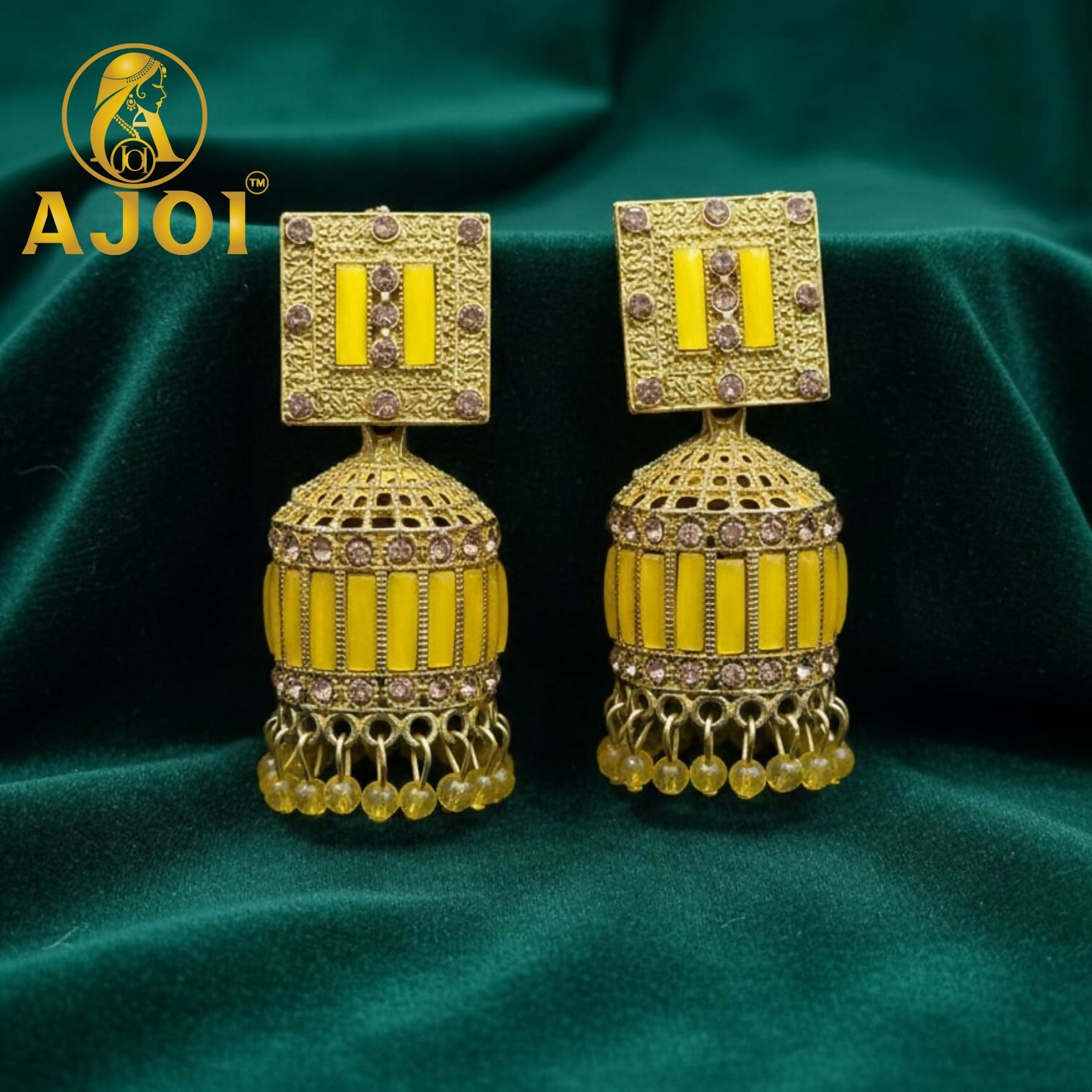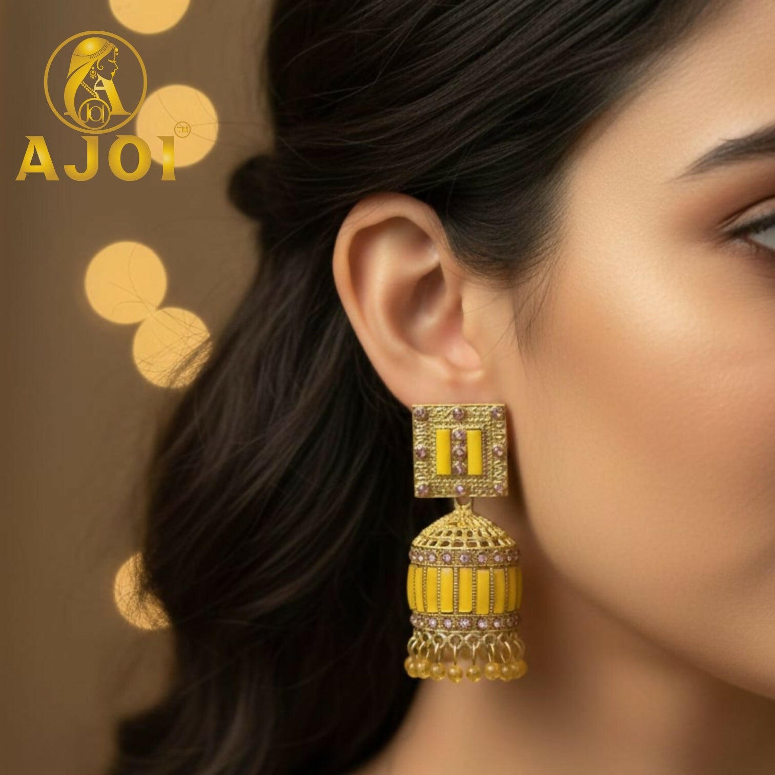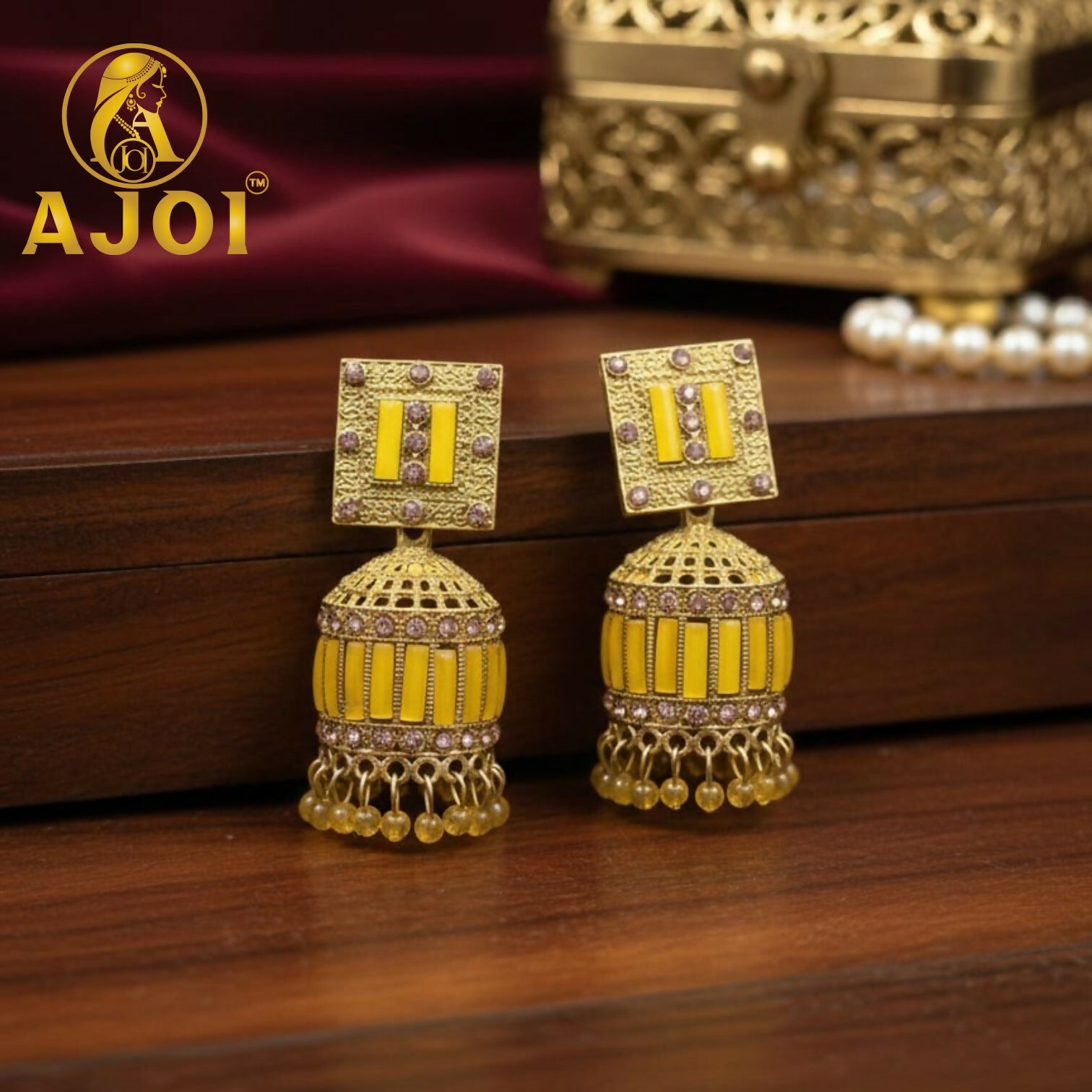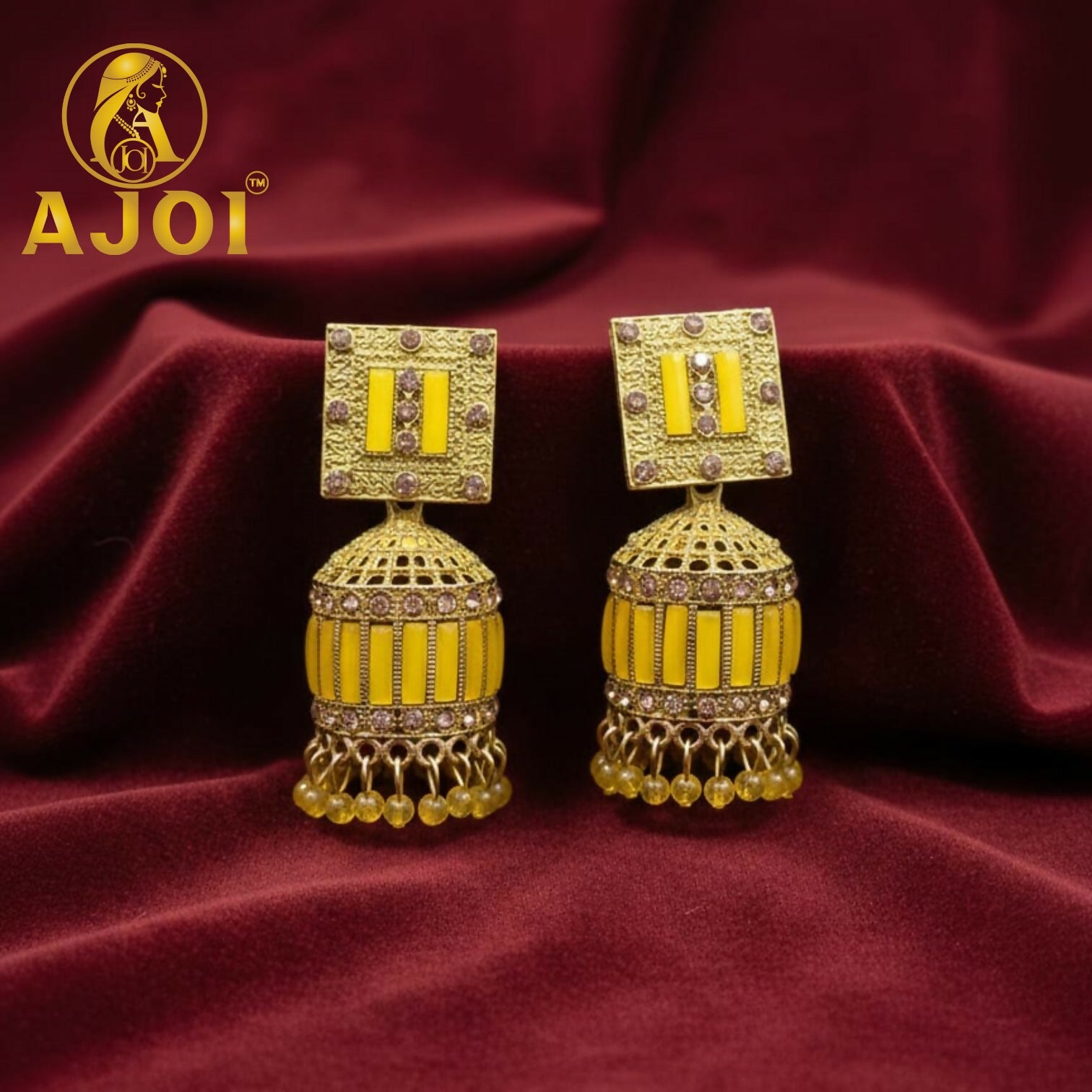 Brighten your ethnic look with these premium mustard yellow designer jhumka earrings. Adorned with intricate gold detailing and sparkling stone embellishments, this stunning pair brings a perfect blend of tradition and contemporary style—ideal for festive celebrations and special occasions.