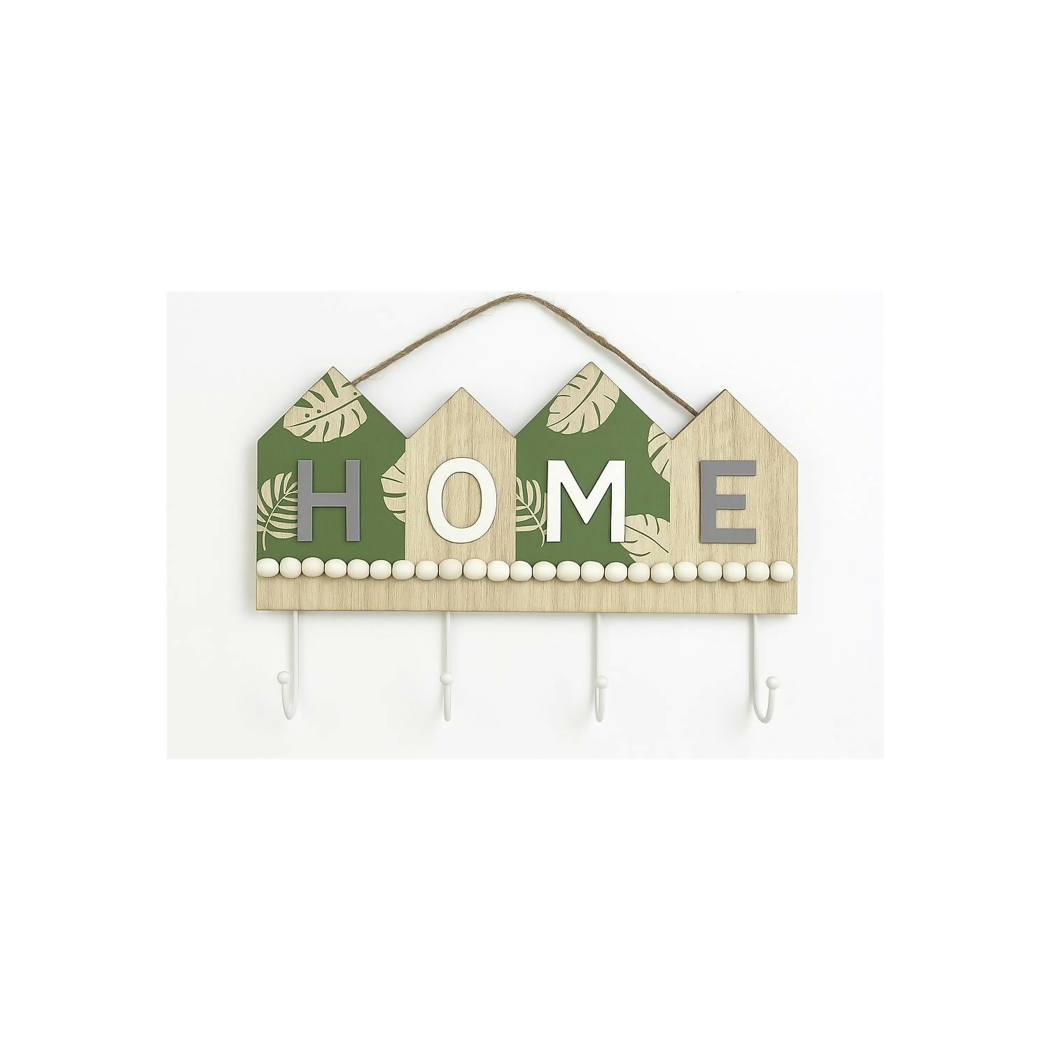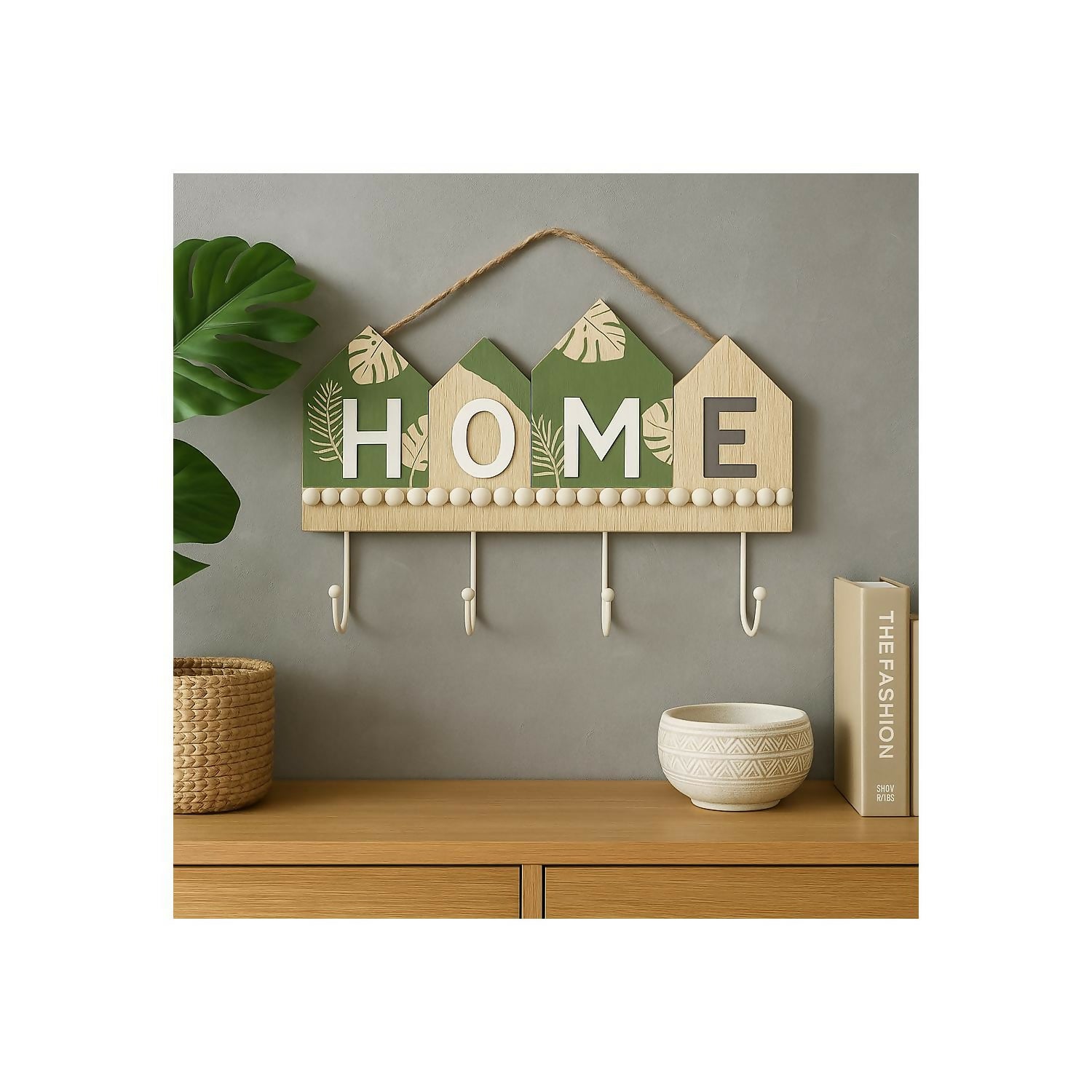 Keep your keys organized in style with this rustic wooden wall key holder featuring a charming “HOME” letter design and leafy accents. Crafted from premium quality wood, it is both sturdy and aesthetically pleasing. The natural wood finish combined with soft green tones creates a warm and cozy look, making it a perfect addition to your entryway, kitchen, bedroom, or living room wall décor. Equipped with four strong hooks, it helps you neatly store keys, lanyards, scarves, or small accessories. The attached rope makes it easy to hang, and its farmhouse-inspired design blends beautifully with modern, bohemian, or minimalist interiors.