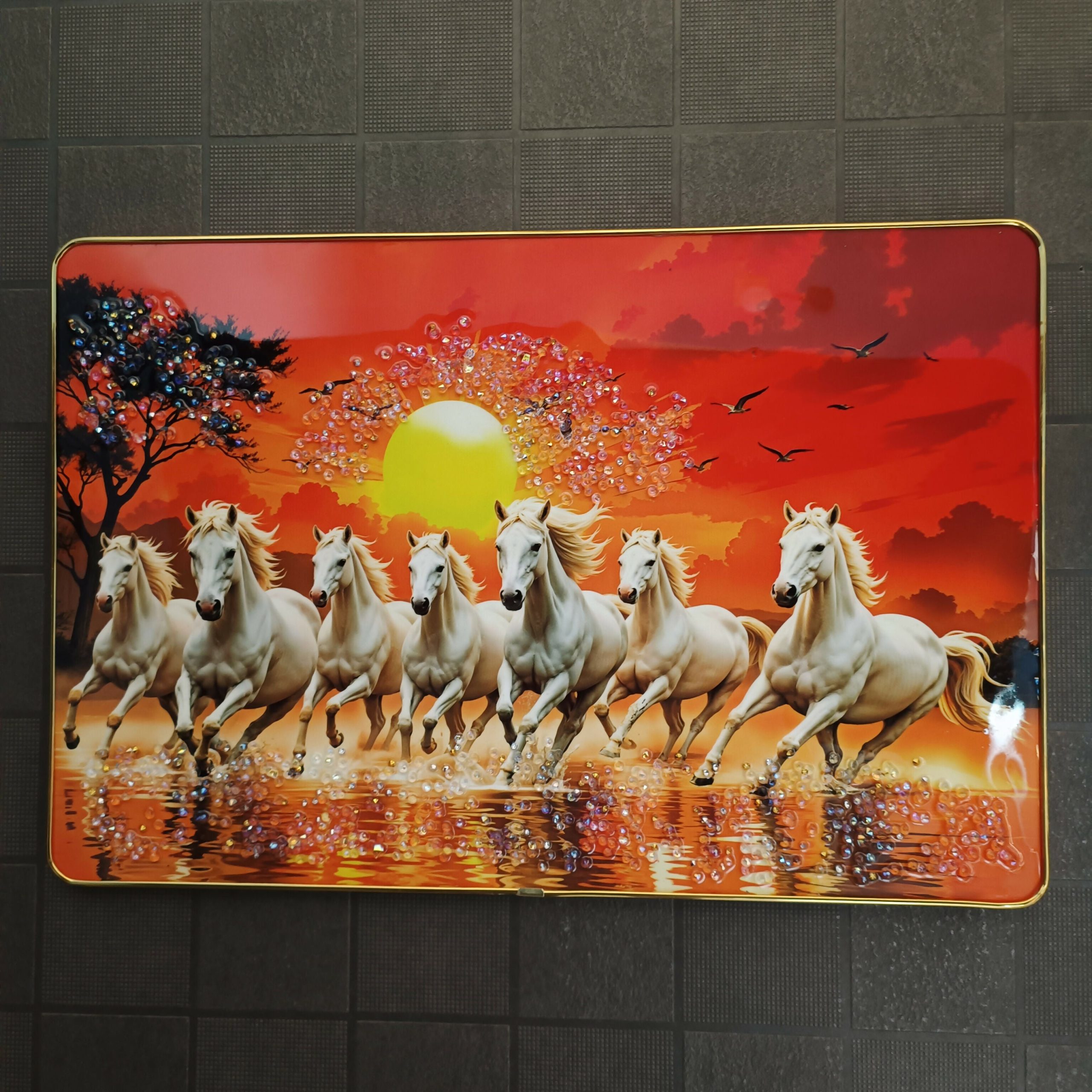 Enhance your space with power, prosperity, and positive energy with this Seven Running Horses Wall Art Frame, inspired by Vastu principles and modern luxury décor styling. Featuring seven white horses running gracefully against a vibrant sunset backdrop, this artwork symbolizes success, strength, growth, and forward movement — making it one of the most preferred wall décor choices for homes and offices.