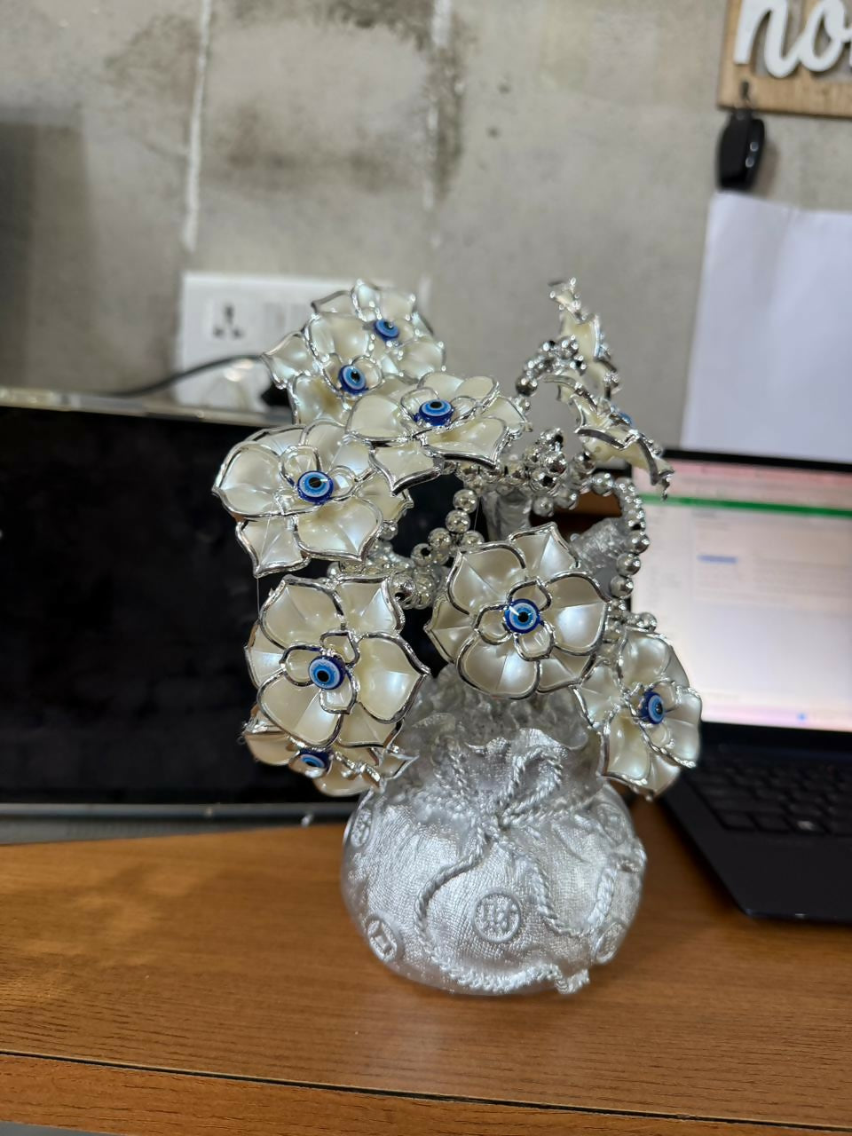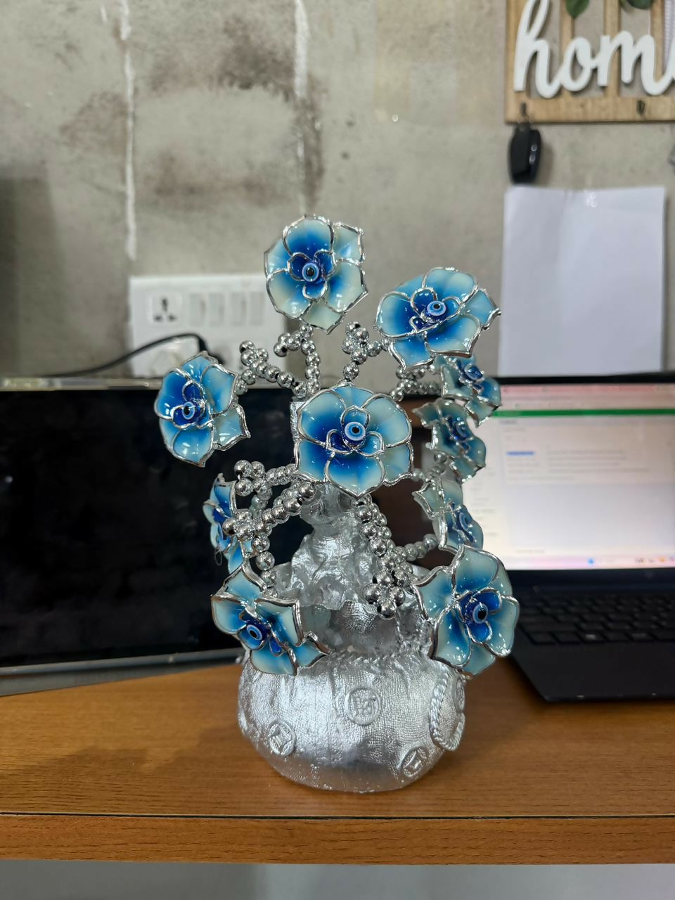 silver lucky tree showpiece, evil eye decor tree, silver flower decor statue, vastu decor tree, decorative tabletop sculpture, lucky tree showpiece for home, luxury home decor statue, office desk decor figurine, positive energy decor item, silver decorative tree statue, living room decor showpiece, feng shui decor tree, good luck decorative statue