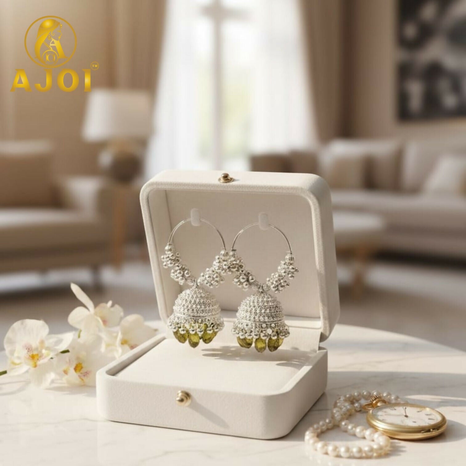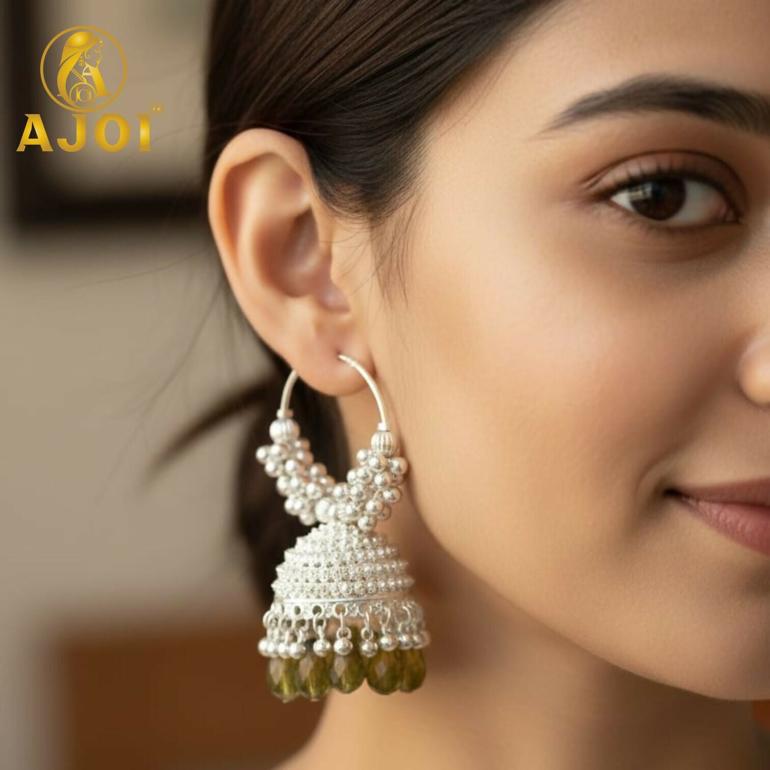 Grace your look with these exquisitely handcrafted silver jhumka hoop earrings, featuring intricate floral beadwork and a finely textured dome design. Accented with deep emerald-green drop beads, this elegant pair radiates royal charm—perfect for weddings, festive celebrations, and statement ethnic styling.