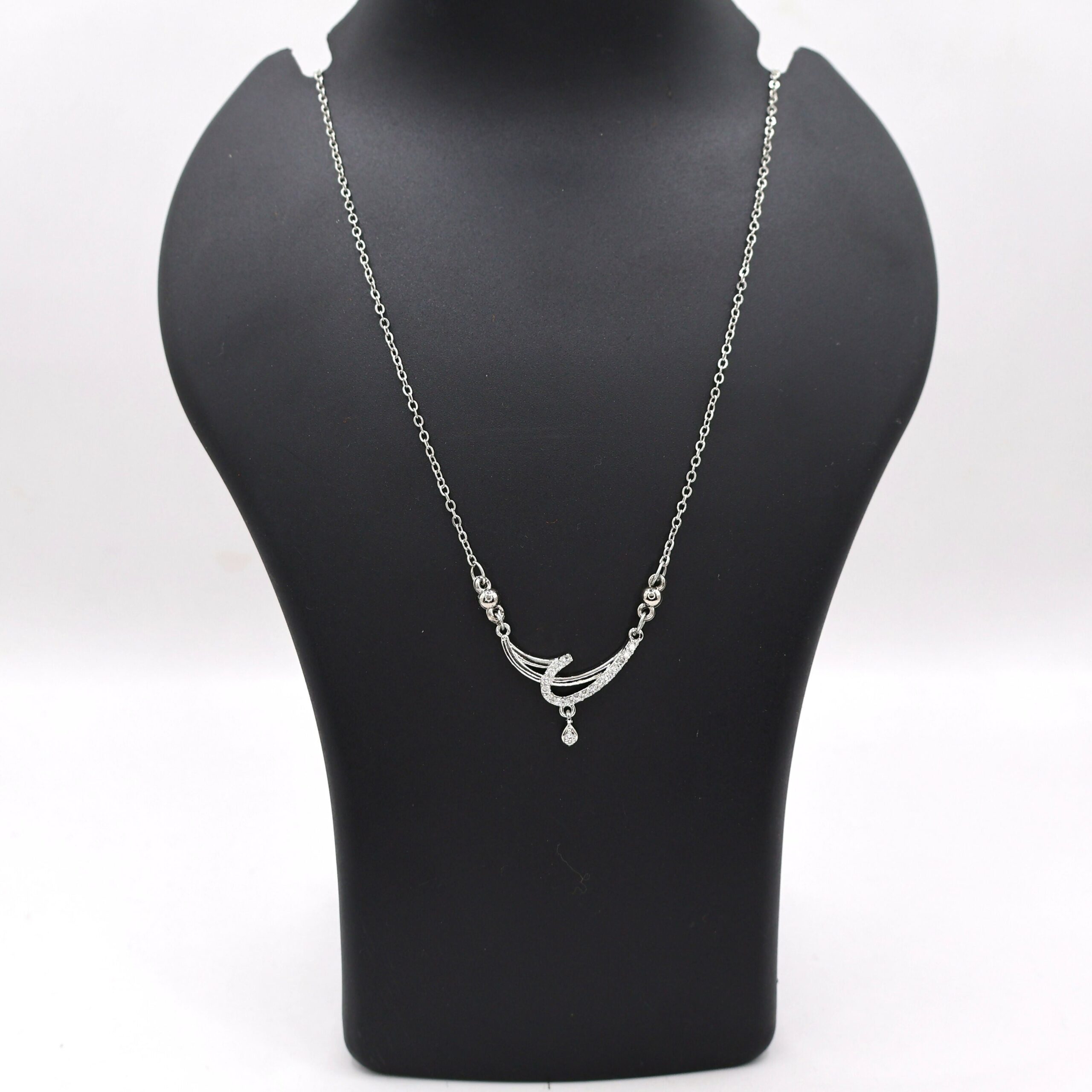 One side of the curve is beautifully paved with sparkling Cubic Zirconia (CZ) stones for brilliant shine, while the other side is highly polished. A delicate CZ teardrop stone dangles from the center, adding movement and an extra focal point of sparkle. The pendant hangs from a fine chain, accented with small, polished beads for a subtle, sophisticated touch.