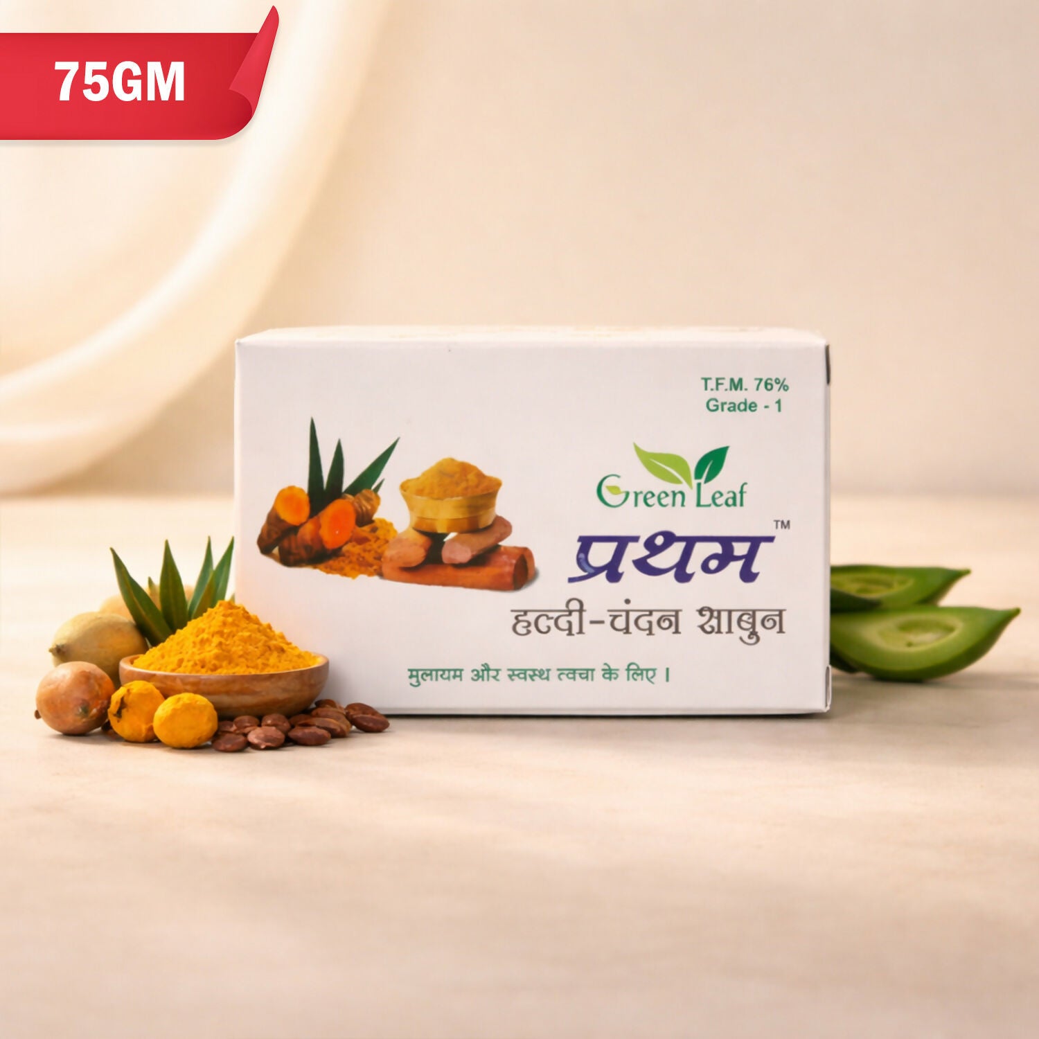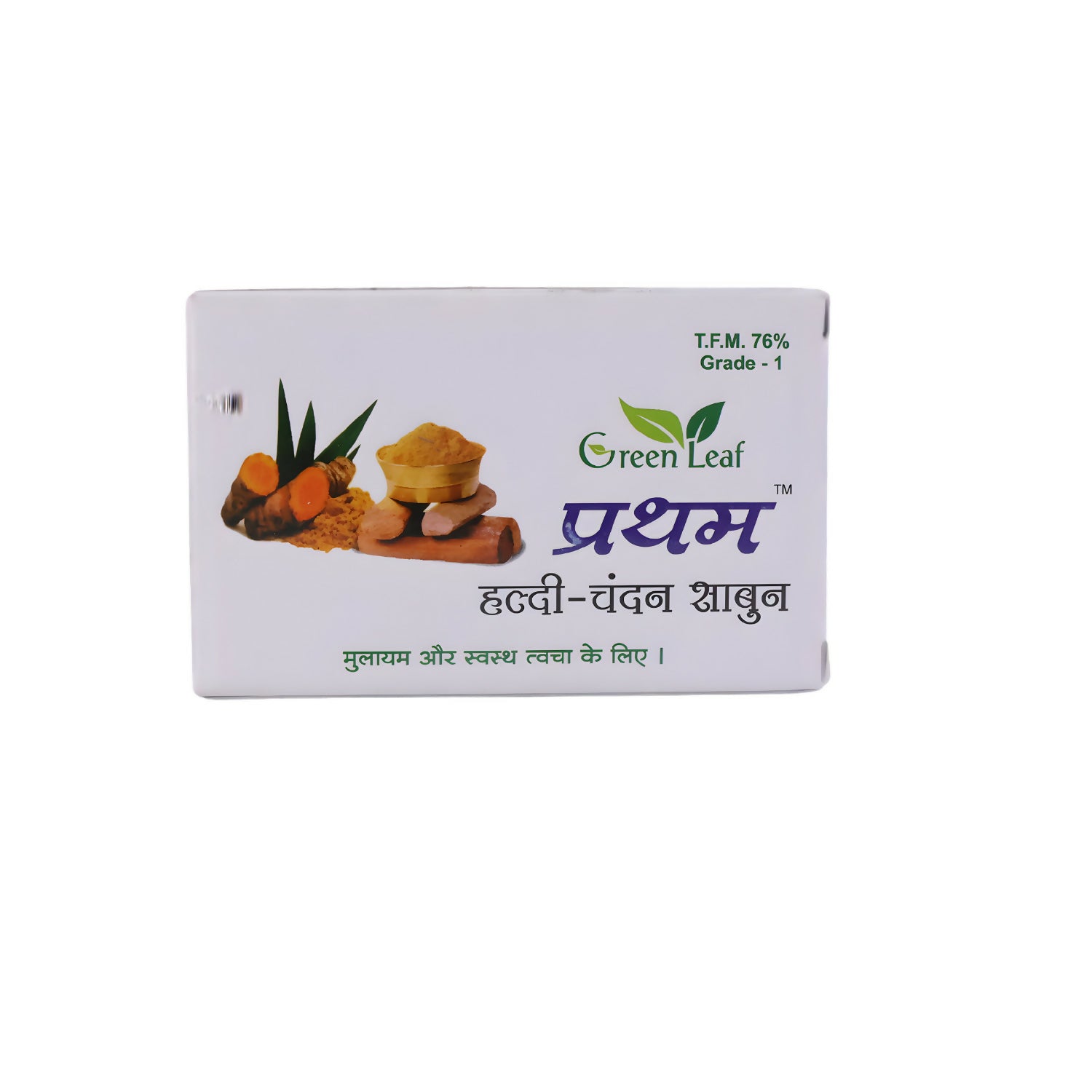 Green Leaf Prathem Turmeric Chandan Soap 75gm is enriched with the traditional goodness of Haldi (Turmeric) and Chandan (Sandalwood) to support healthy and refreshed skin. Formulated with high TFM Grade-1 quality, it helps cleanse effectively while maintaining natural moisture balance. Turmeric is known for its skin-purifying properties, while sandalwood helps soothe and enhance skin glow. The rich lather removes dirt and excess oil without leaving the skin dry. Suitable for daily bathing, it keeps your skin soft, smooth, and revitalized.