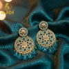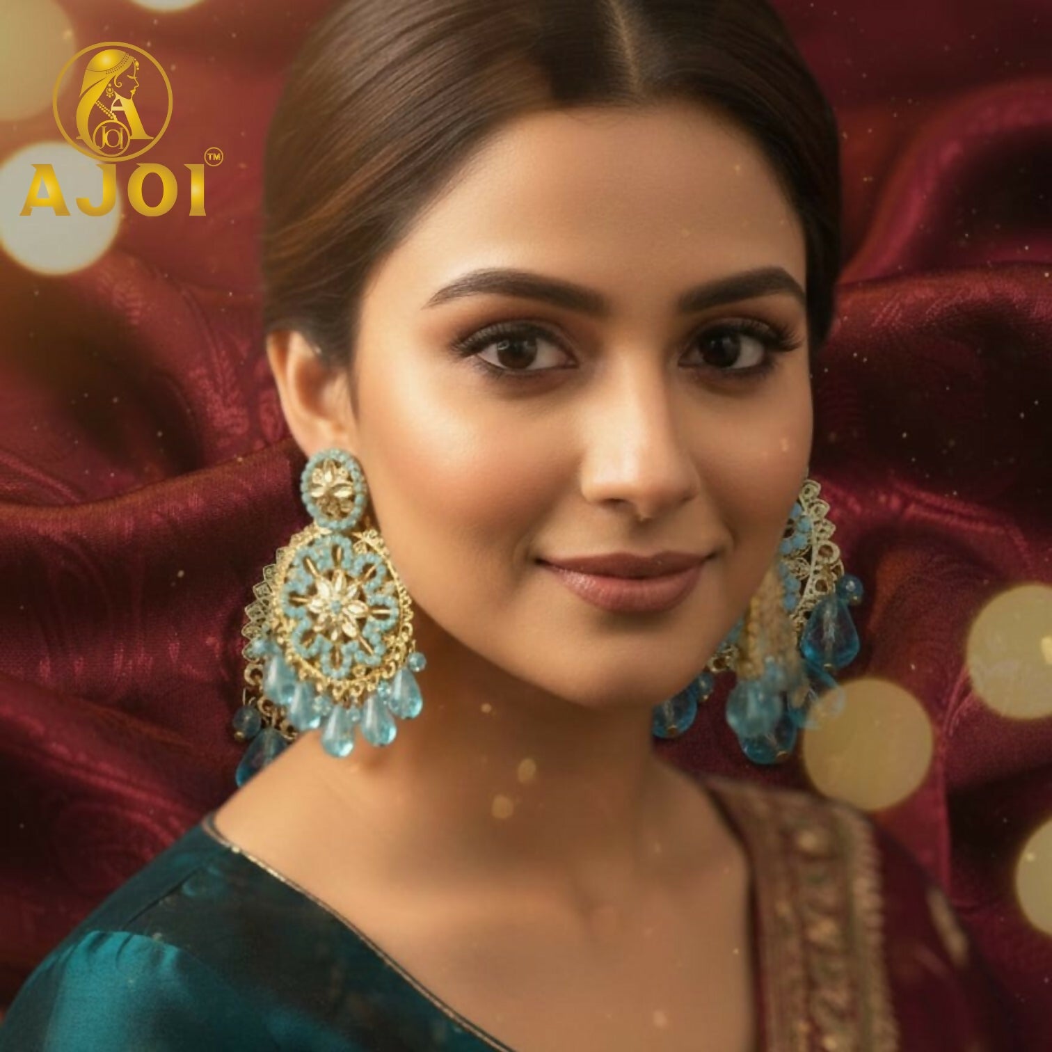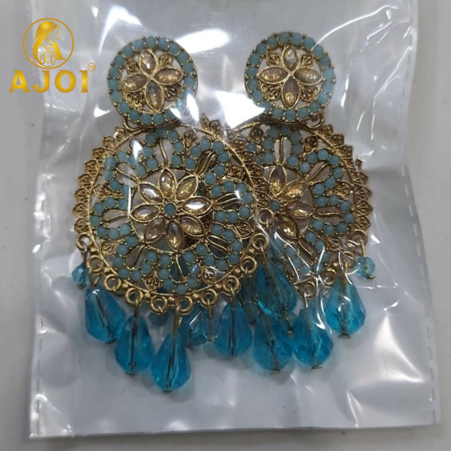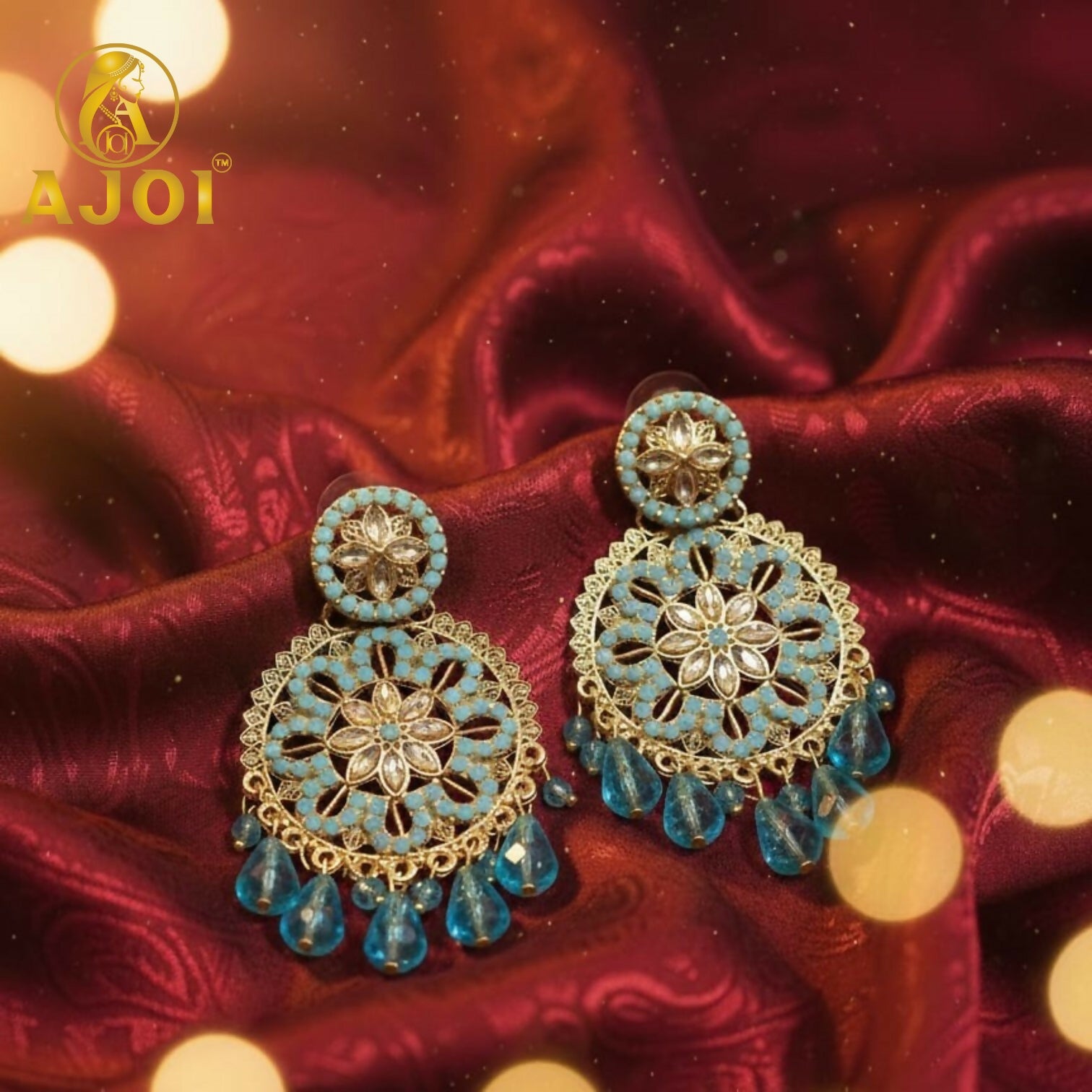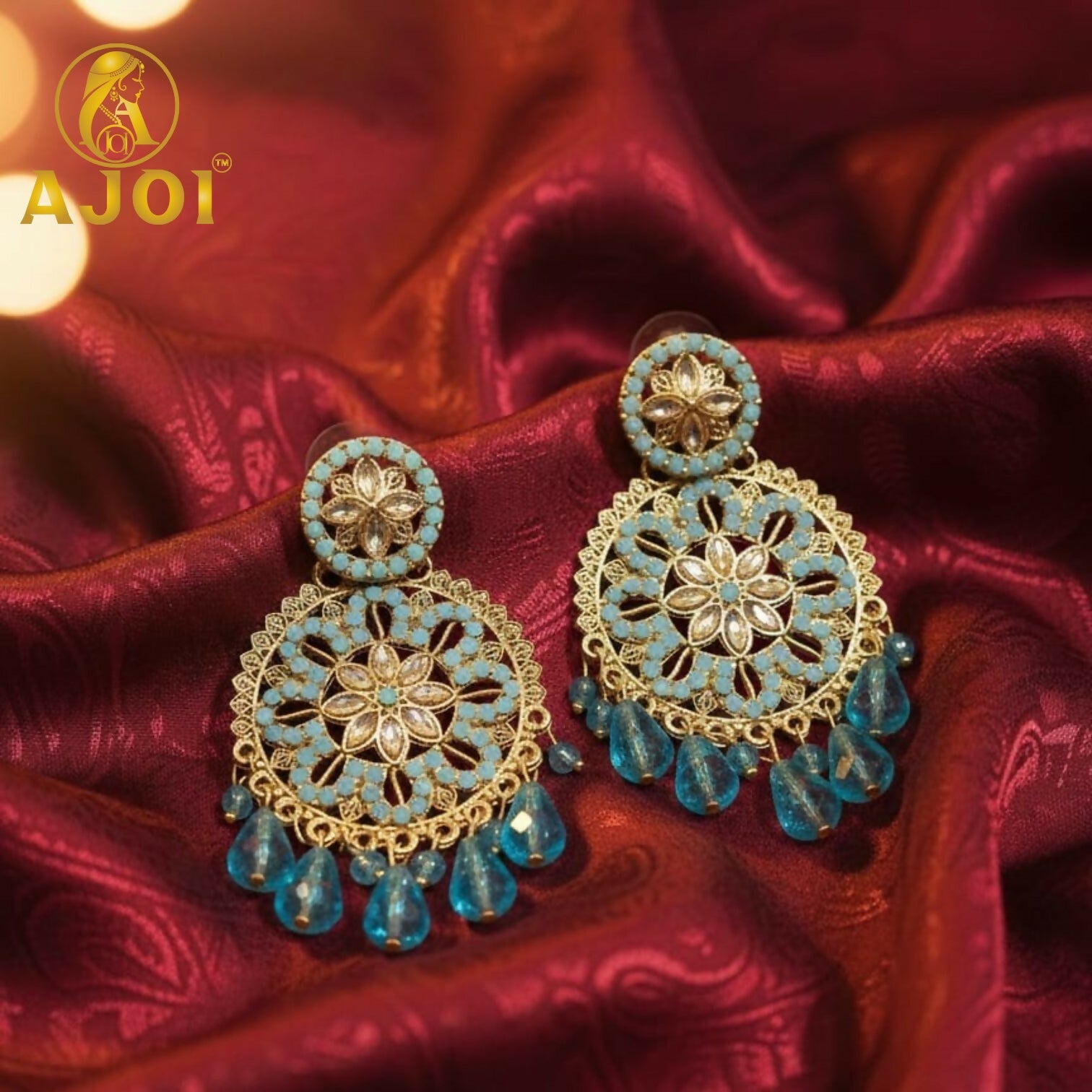 The centerpiece features a beautifully carved floral motif highlighted with subtle crystal accents, while the inner ring is adorned with refreshing turquoise beadwork that enhances the richness of the gold-tone finish. The bottom is gracefully finished with translucent turquoise teardrop danglers, adding fluid movement and a luminous charm with every step.