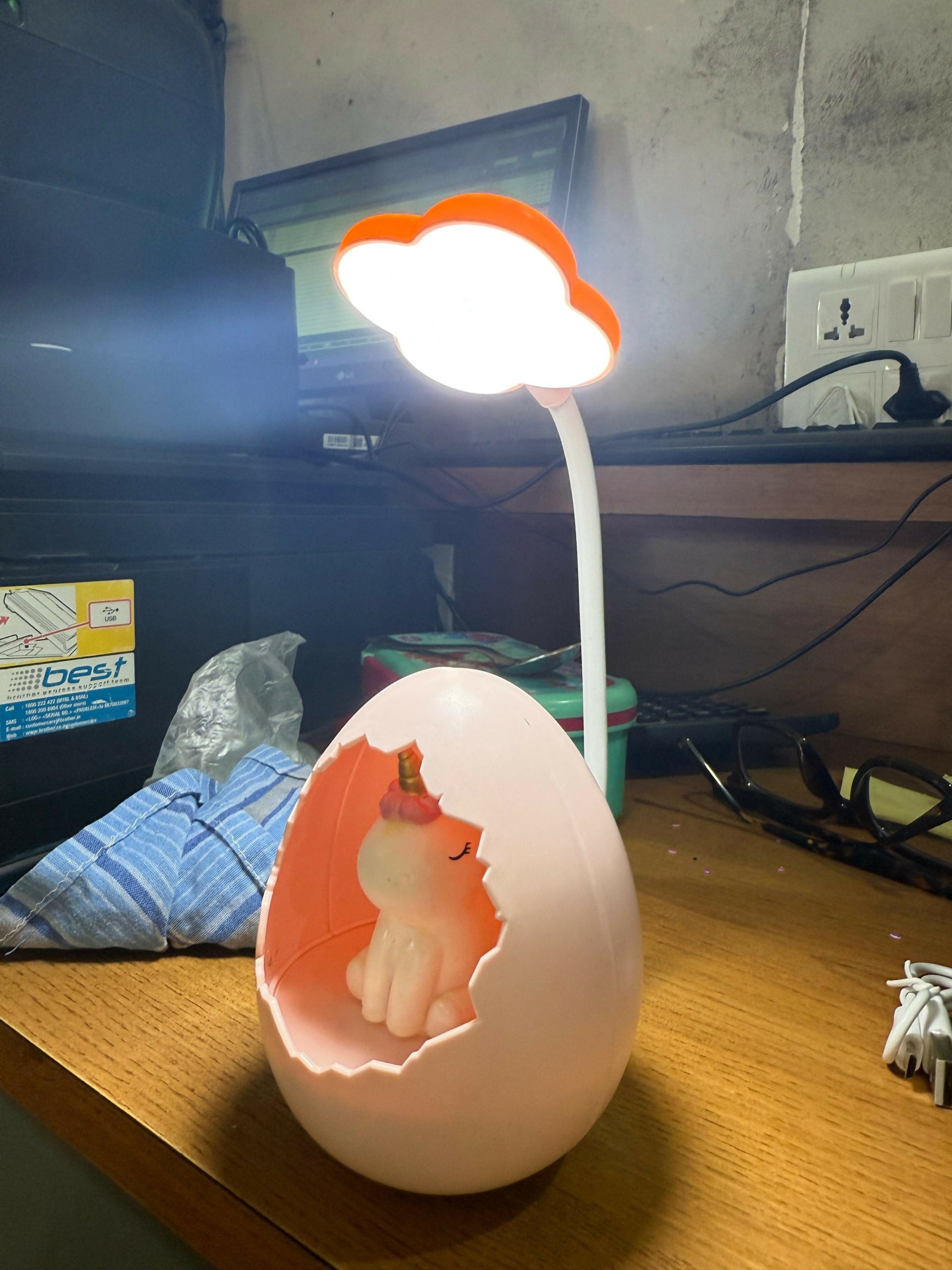 Bring a magical touch to your child’s room with this adorable unicorn egg desk lamp. Designed with a cute unicorn sitting inside a cracked egg shell, this lamp combines a soft night light with a flexible study lamp for reading, drawing, and homework. The cloud-shaped LED lamp head provides gentle lighting, while the warm glow inside the egg creates a calming bedtime atmosphere. With its rechargeable battery and lightweight design, this lamp is perfect for study tables, bedside tables, nurseries, and kids’ bedrooms.
