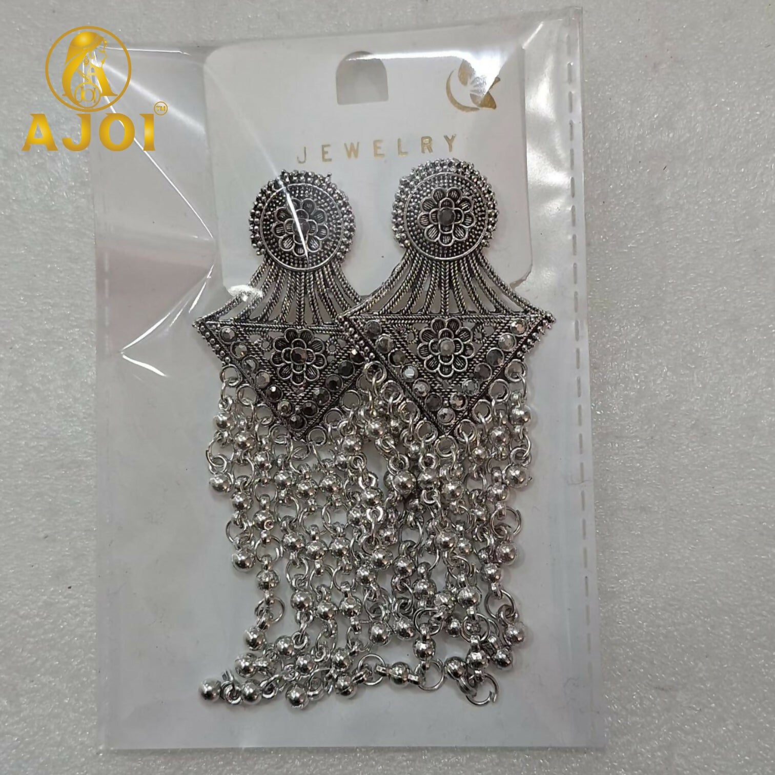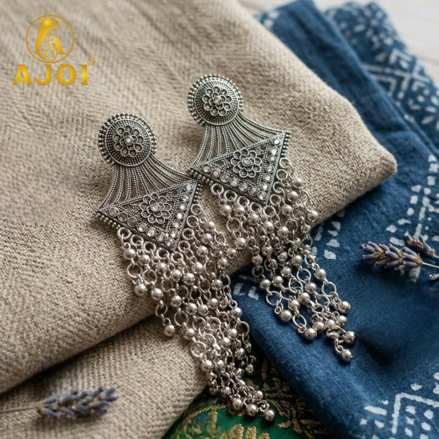 Make a striking statement with these beautifully crafted vintage floral silver tassel earrings. Designed with intricate circular floral studs, elegant fan-shaped detailing, and cascading chain tassels adorned with delicate pearl-like beads, these earrings capture timeless ethnic charm. The antique silver finish enhances their heritage appeal, making them perfect for festive occasions, weddings, and bold traditional styling.