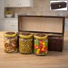 Enhance your serving style with this beautifully crafted wooden dry fruit and mukhwas storage box featuring three transparent glass jars with secure lids. Designed with intricate carved detailing on the exterior and a sturdy hinged lid with a metallic lock, this elegant organizer is perfect for storing dry fruits, mouth fresheners, candies, seeds, and snacks. The glass jars keep contents fresh while allowing easy visibility, making it convenient for everyday use as well as special occasions. Its premium wooden finish adds a traditional yet classy touch to your dining table, kitchen counter, or living space. Ideal for festive gifting, weddings, housewarmings, and celebrations, this storage box combines functionality with decorative charm.