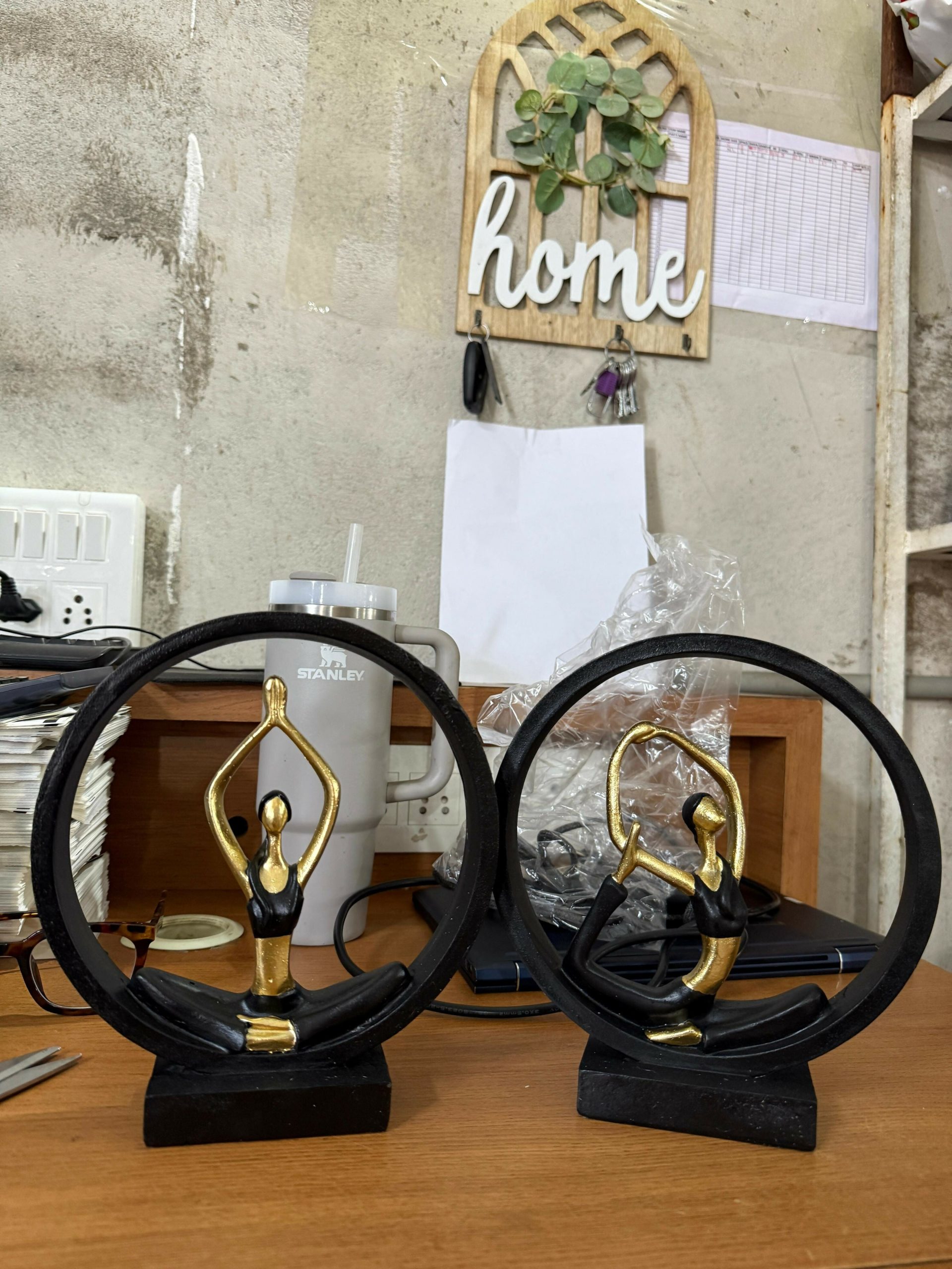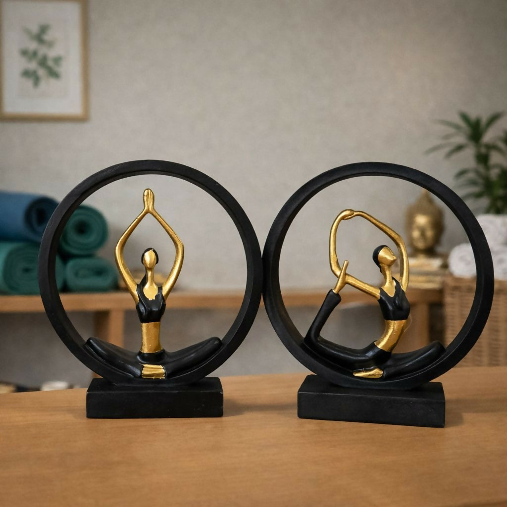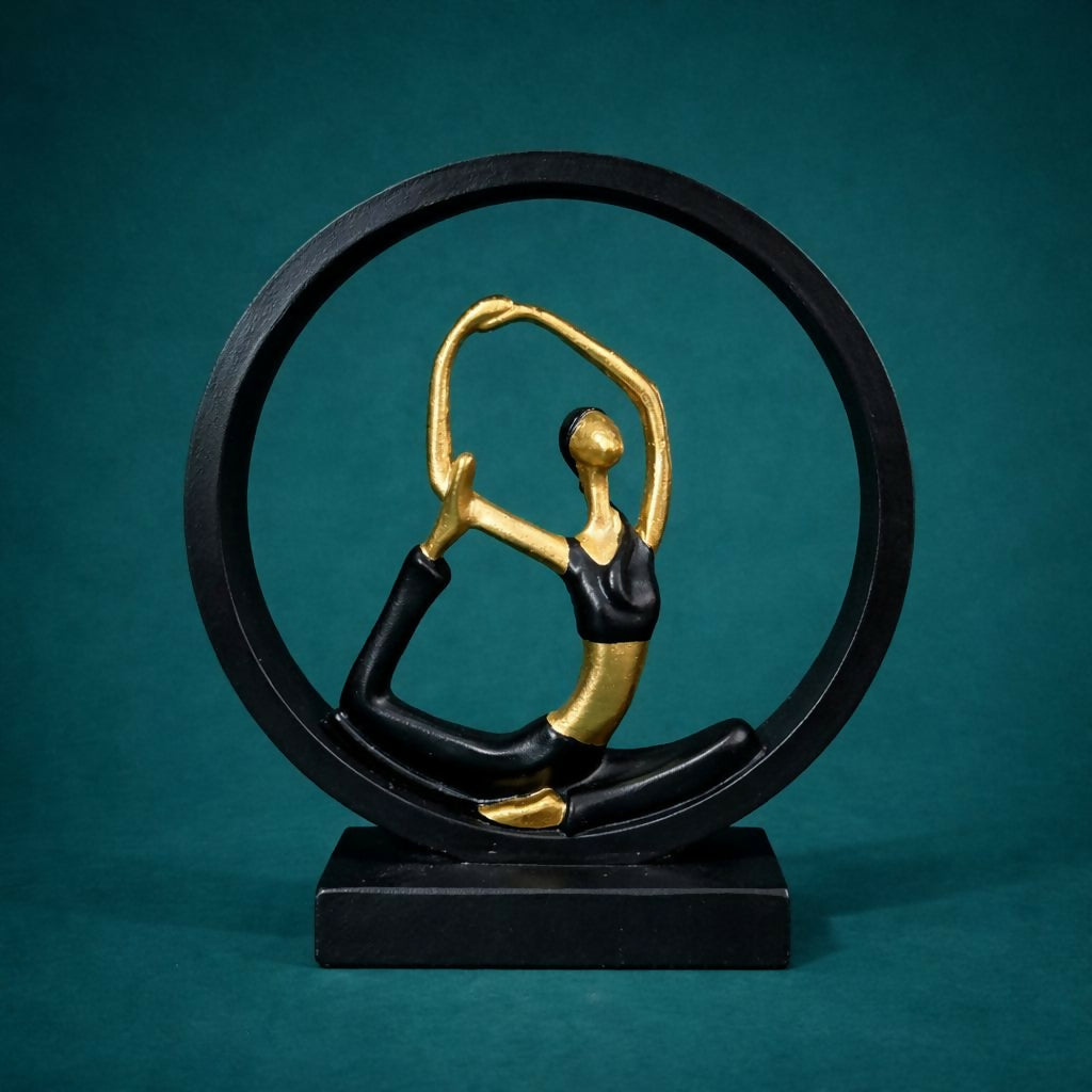 Enhance the calm and elegance of your space with this stylish yoga meditation figurine showpiece. Designed with a graceful yoga pose inside a circular frame, this decorative statue represents balance, mindfulness, and inner peace. The elegant black and gold color combination gives the sculpture a modern and luxurious look that complements contemporary interiors. Perfect for decorating living rooms, office desks, yoga studios, meditation corners, or shelves, this artistic showpiece creates a peaceful and inspiring atmosphere. It also makes a thoughtful gift for yoga lovers, wellness enthusiasts, and home décor collectors.
