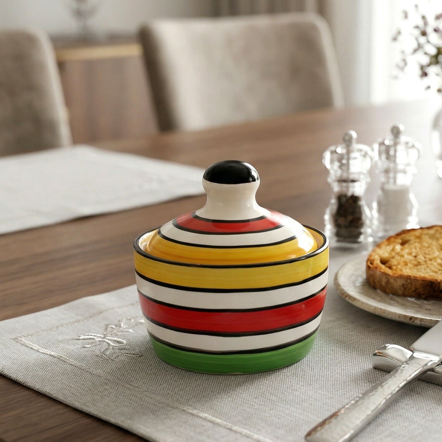 Lotum Royal Stoneware pesh karte hain ek khoobsurat aur multipurpose Ceramic Butter Pot. Ye hand-painted colourful stripes wala pot na sirf butter rakhne ke kaam aata hai, balki aapke kitchen ki shaan bhi badhata hai. Iska high-quality stoneware material butter ko fresh aur sahi temperature par rakhne mein madad karta hai.
