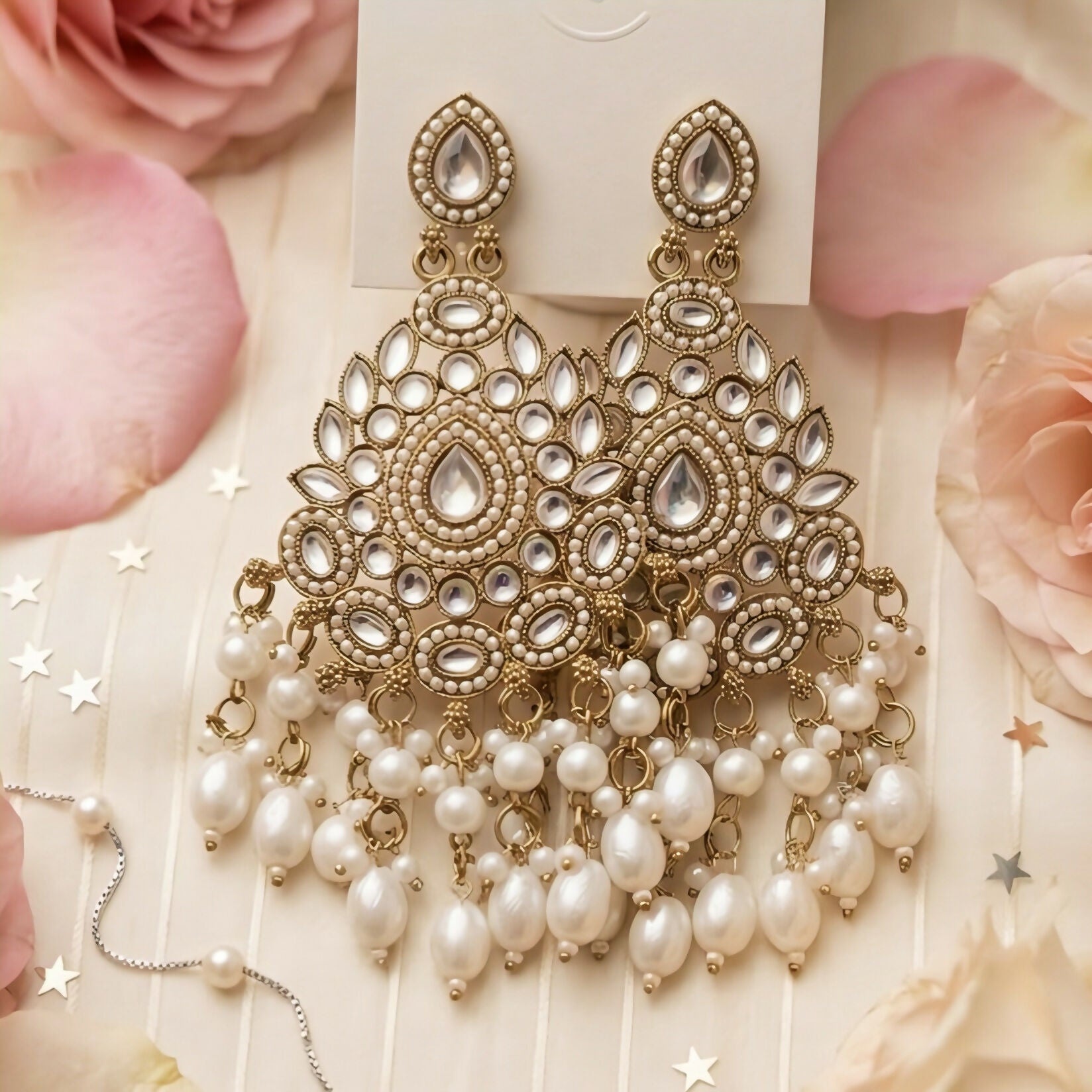 | Material | Gold-plated alloy, Kundan stones, Synthetic pearls |
