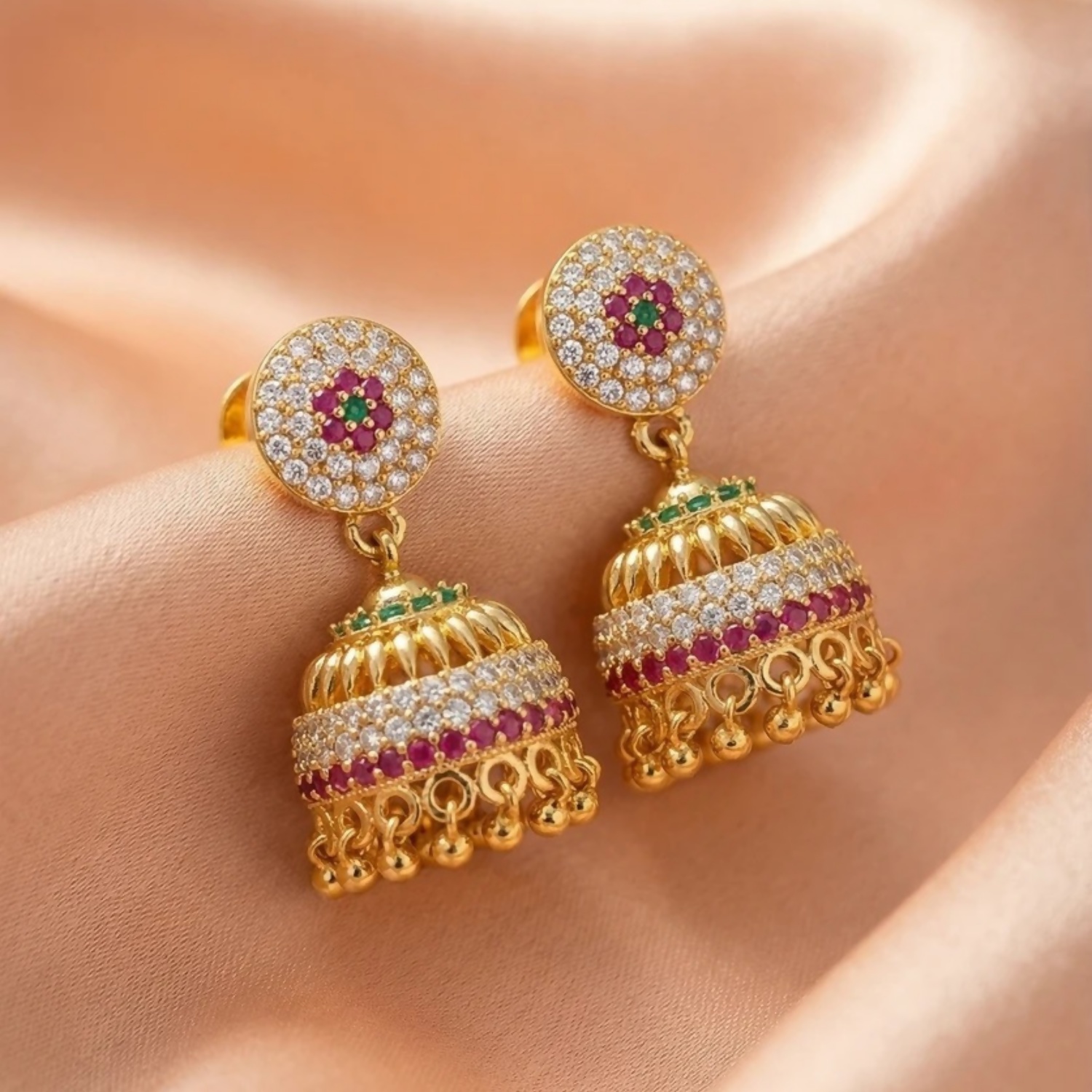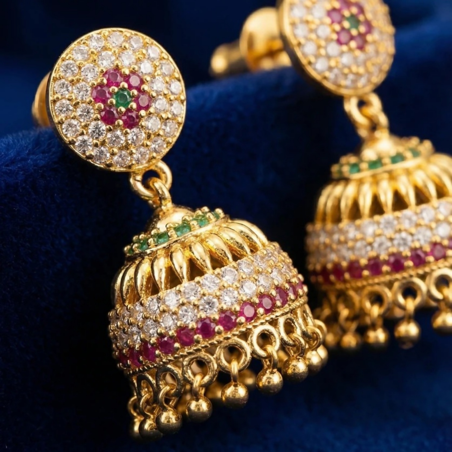 Vibrant Embellishments: The Jhumka base is meticulously layered with rows of emerald green, ruby red, and sparkling white stones, creating a rich, multi-colored look.