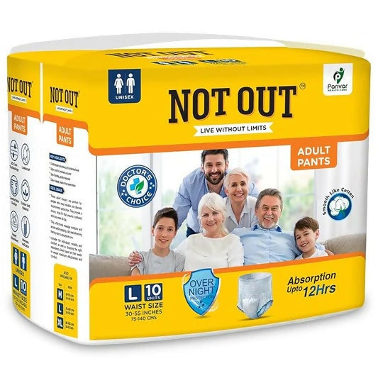 Enjoy extended convenience on outings with Not Out adult Pant diapers designed for all-day wear. Providing up to 10 hours of protection, savor every moment without interruptions.