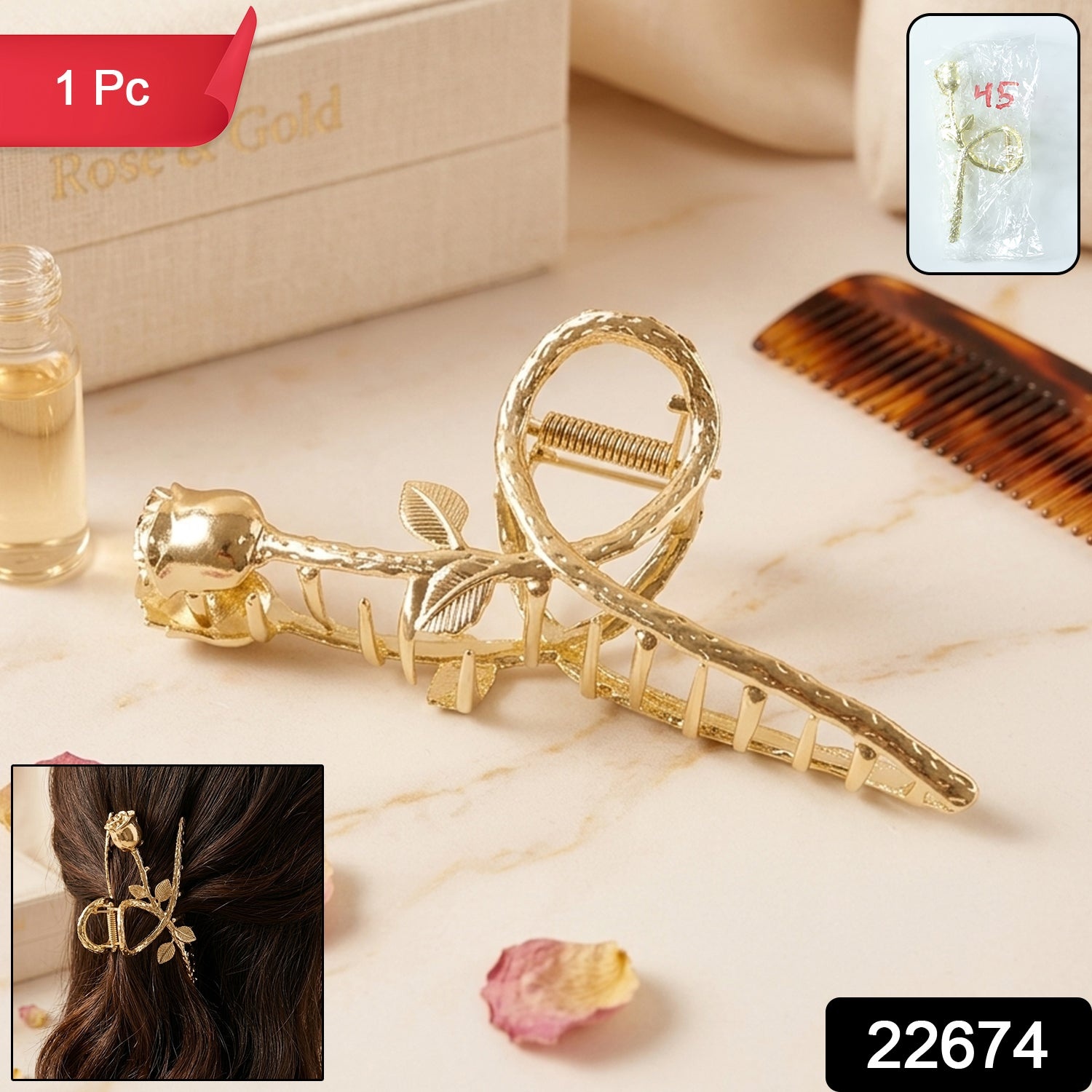 Add a luxurious touch to your hairstyle with this beautifully crafted gold rose design hair claw clip. Inspired by the elegance of a blooming rose, this clip features a unique long stem floral design that enhances your overall look. Its sturdy grip ensures your hair stays securely in place while providing comfort throughout the day. Perfect for both casual styling and special occasions, this stylish accessory elevates your fashion effortlessly. A must-have piece for those who love elegant and timeless hair accessories.